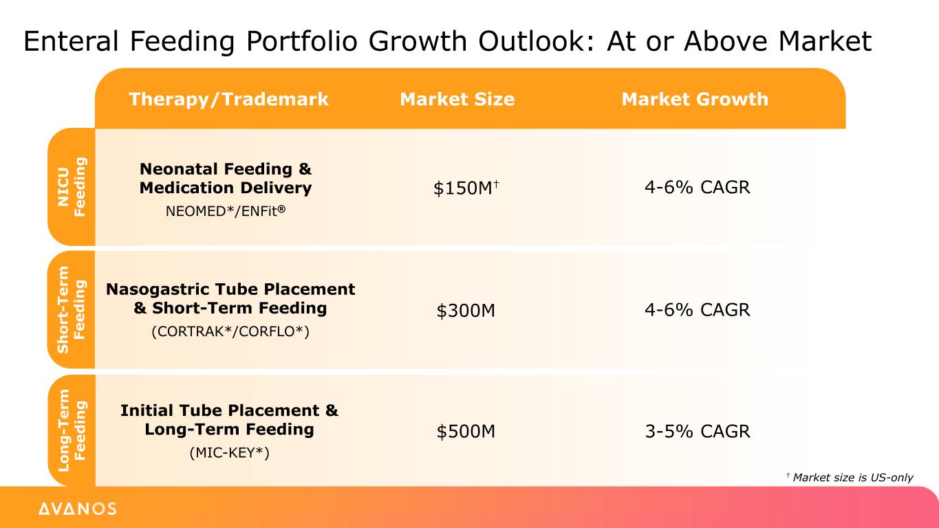Therapy/Trademark Market Size Market Growth Nasogastric Tube Placement & Short-Term Feeding (CORTRAK*/CORFLO*) Neonatal Feeding & Medication Delivery NEOMED*/ENFit® Enteral Feeding Portfolio Growth Outlook: At or Above Market † Market size is US-only $300M Initial Tube Placement & Long-Term Feeding (MIC-KEY*) $500M S h o r t- T e r m F e e d in g L o n g -T e r m F e e d in g $150M†N I C U F e e d in g 4-6% CAGR 4-6% CAGR 3-5% CAGR N I C U F e e d in g