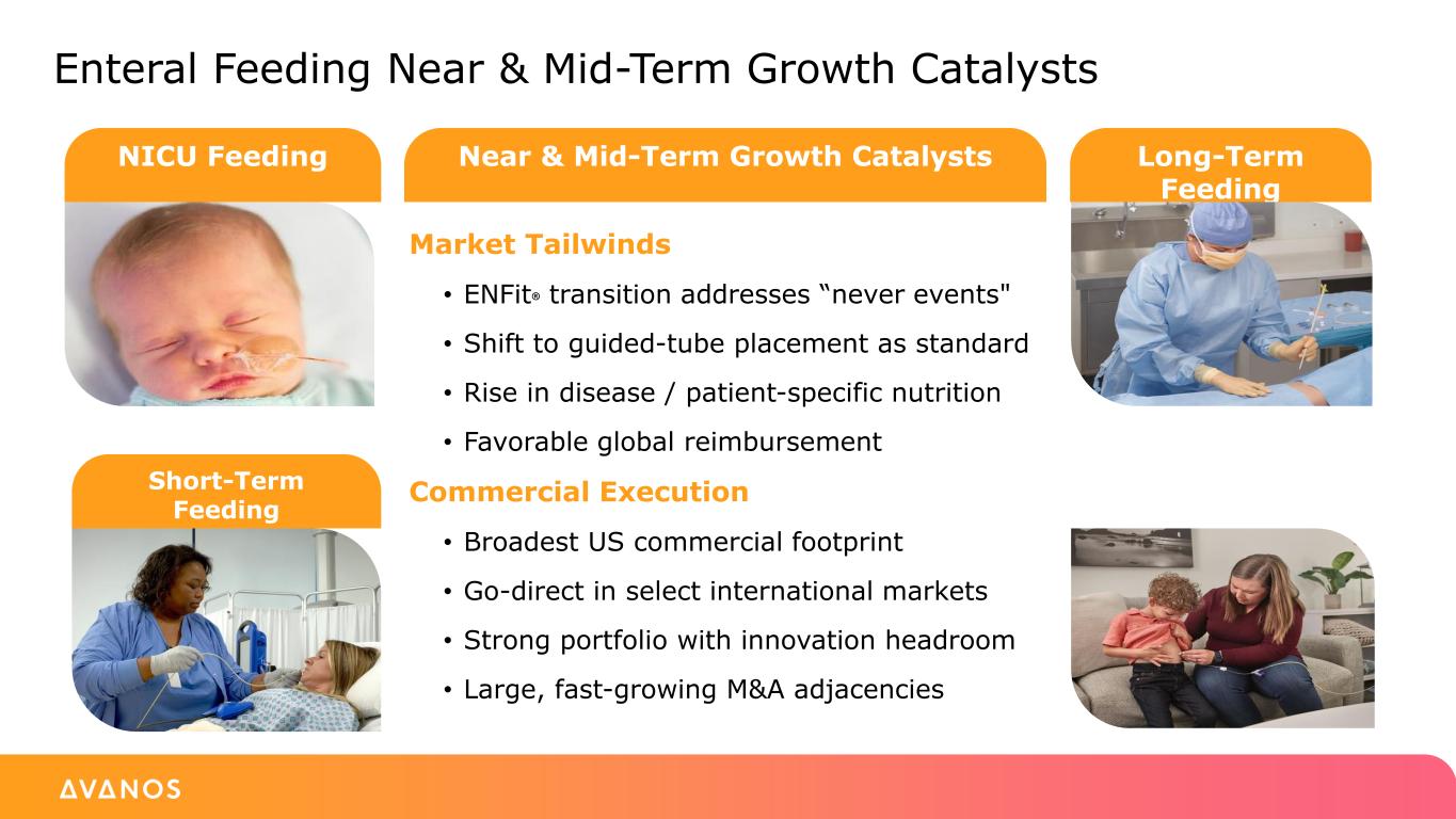 Near & Mid-Term Growth CatalystsNICU Feeding Enteral Feeding Near & Mid-Term Growth Catalysts Market Tailwinds • ENFit® transition addresses “never events" • Shift to guided-tube placement as standard • Rise in disease / patient-specific nutrition • Favorable global reimbursement Commercial Execution • Broadest US commercial footprint • Go-direct in select international markets • Strong portfolio with innovation headroom • Large, fast-growing M&A adjacencies Long-Term Feeding Short-Term Feeding