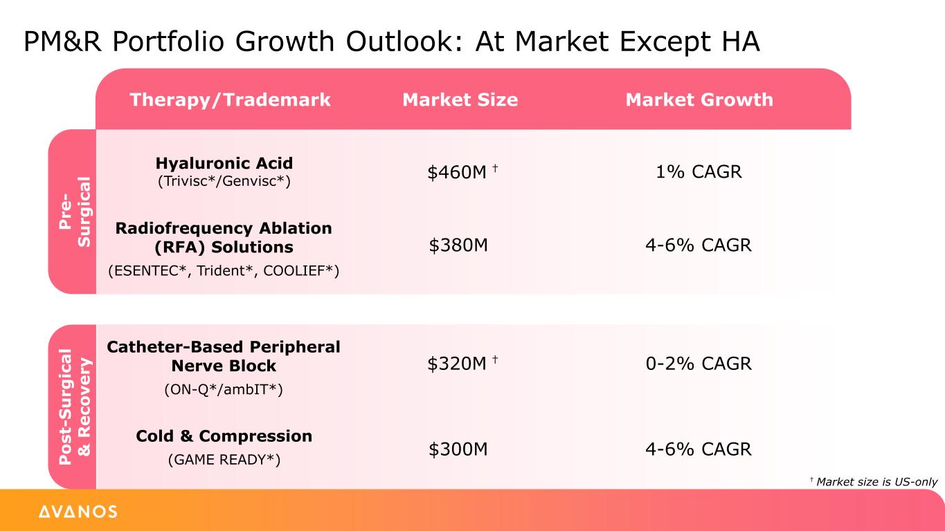 Radiofrequency Ablation (RFA) Solutions (ESENTEC*, Trident*, COOLIEF*) Hyaluronic Acid (Trivisc*/Genvisc*) PM&R Portfolio Growth Outlook: At Market Except HA † Market size is US-only $380M Catheter-Based Peripheral Nerve Block (ON-Q*/ambIT*) Cold & Compression (GAME READY*) $300M $320M † P r e - S u r g ic a l P o s t- S u r g ic a l & R e c o v e r y $460M † 1% CAGR 4-6% CAGR 0-2% CAGR 4-6% CAGR Therapy/Trademark Market Size Market Growth