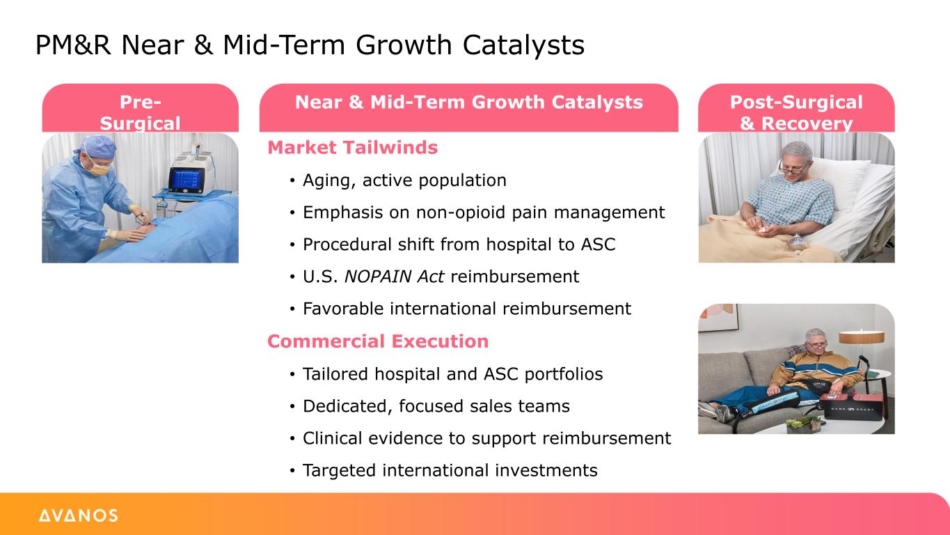 Pre- Surgical PM&R Near & Mid-Term Growth Catalysts Post-Surgical & Recovery Near & Mid-Term Growth Catalysts Market Tailwinds • Aging, active population • Emphasis on non-opioid pain management • Procedural shift from hospital to ASC • U.S. NOPAIN Act reimbursement • Favorable international reimbursement Commercial Execution • Tailored hospital and ASC portfolios • Dedicated, focused sales teams • Clinical evidence to support reimbursement • Targeted international investments