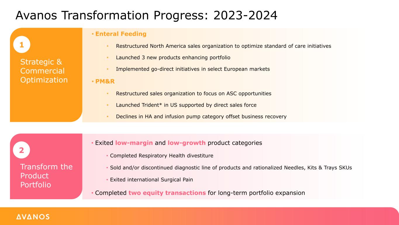 • Enteral Feeding • Restructured North America sales organization to optimize standard of care initiatives • Launched 3 new products enhancing portfolio • Implemented go-direct initiatives in select European markets • PM&R • Restructured sales organization to focus on ASC opportunities • Launched Trident* in US supported by direct sales force • Declines in HA and infusion pump category offset business recovery Avanos Transformation Progress: 2023-2024 1 2 Strategic & Commercial Optimization Transform the Product Portfolio • Exited low-margin and low-growth product categories • Completed Respiratory Health divestiture • Sold and/or discontinued diagnostic line of products and rationalized Needles, Kits & Trays SKUs • Exited international Surgical Pain • Completed two equity transactions for long-term portfolio expansion
