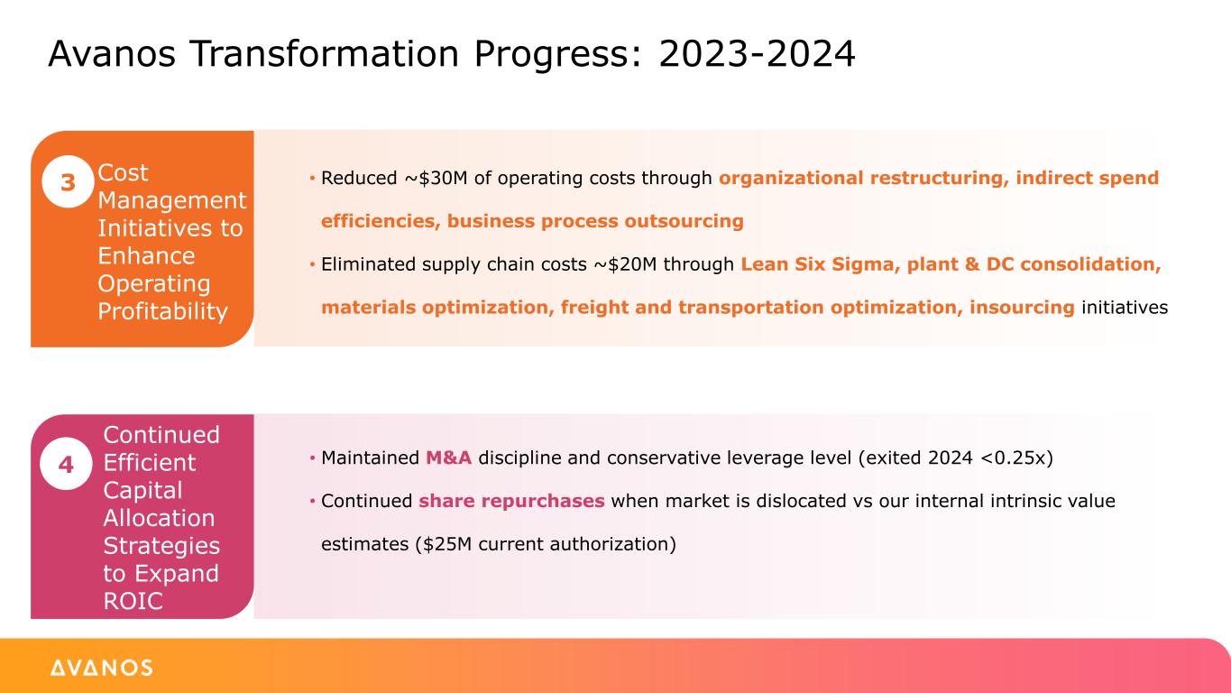 • Maintained M&A discipline and conservative leverage level (exited 2024 <0.25x) • Continued share repurchases when market is dislocated vs our internal intrinsic value estimates ($25M current authorization) Avanos Transformation Progress: 2023-2024 Transform the Product Portfolio 3 Cost Management Initiatives to Enhance Operating Profitability 4 Continued Efficient Capital Allocation Strategies to Expand ROIC • Reduced ~$30M of operating costs through organizational restructuring, indirect spend efficiencies, business process outsourcing • Eliminated supply chain costs ~$20M through Lean Six Sigma, plant & DC consolidation, materials optimization, freight and transportation optimization, insourcing initiatives