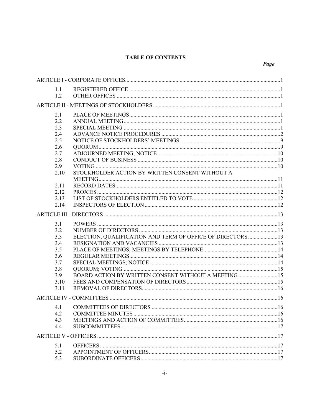 -i- TABLE OF CONTENTS Page ARTICLE I - CORPORATE OFFICES ............................................................................................................... 1 1.1 REGISTERED OFFICE ............................................................................................................ 1 1.2 OTHER OFFICES ..................................................................................................................... 1 ARTICLE II - MEETINGS OF STOCKHOLDERS ........................................................................................... 1 2.1 PLACE OF MEETINGS ............................................................................................................ 1 2.2 ANNUAL MEETING ................................................................................................................ 1 2.3 SPECIAL MEETING ................................................................................................................ 1 2.4 ADVANCE NOTICE PROCEDURES ..................................................................................... 2 2.5 NOTICE OF STOCKHOLDERS’ MEETINGS ........................................................................ 9 2.6 QUORUM .................................................................................................................................. 9 2.7 ADJOURNED MEETING; NOTICE ...................................................................................... 10 2.8 CONDUCT OF BUSINESS .................................................................................................... 10 2.9 VOTING .................................................................................................................................. 10 2.10 STOCKHOLDER ACTION BY WRITTEN CONSENT WITHOUT A MEETING ................................................................................................................................ 11 2.11 RECORD DATES .................................................................................................................... 11 2.12 PROXIES ................................................................................................................................. 12 2.13 LIST OF STOCKHOLDERS ENTITLED TO VOTE ............................................................ 12 2.14 INSPECTORS OF ELECTION ............................................................................................... 12 ARTICLE III - DIRECTORS ............................................................................................................................ 13 3.1 POWERS ................................................................................................................................. 13 3.2 NUMBER OF DIRECTORS ................................................................................................... 13 3.3 ELECTION, QUALIFICATION AND TERM OF OFFICE OF DIRECTORS ..................... 13 3.4 RESIGNATION AND VACANCIES ..................................................................................... 13 3.5 PLACE OF MEETINGS; MEETINGS BY TELEPHONE ..................................................... 14 3.6 REGULAR MEETINGS .......................................................................................................... 14 3.7 SPECIAL MEETINGS; NOTICE ........................................................................................... 14 3.8 QUORUM; VOTING .............................................................................................................. 15 3.9 BOARD ACTION BY WRITTEN CONSENT WITHOUT A MEETING ............................ 15 3.10 FEES AND COMPENSATION OF DIRECTORS ................................................................. 15 3.11 REMOVAL OF DIRECTORS ................................................................................................. 16 ARTICLE IV - COMMITTEES ........................................................................................................................ 16 4.1 COMMITTEES OF DIRECTORS .......................................................................................... 16 4.2 COMMITTEE MINUTES ....................................................................................................... 16 4.3 MEETINGS AND ACTION OF COMMITTEES ................................................................... 16 4.4 SUBCOMMITTEES ................................................................................................................ 17 ARTICLE V - OFFICERS ................................................................................................................................. 17 5.1 OFFICERS ............................................................................................................................... 17 5.2 APPOINTMENT OF OFFICERS ............................................................................................ 17 5.3 SUBORDINATE OFFICERS .................................................................................................. 17