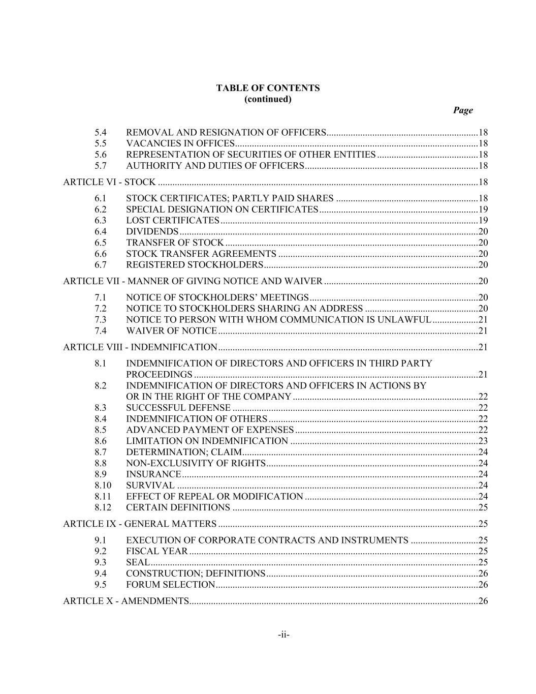 TABLE OF CONTENTS (continued) Page -ii- 5.4 REMOVAL AND RESIGNATION OF OFFICERS ............................................................... 18 5.5 VACANCIES IN OFFICES ..................................................................................................... 18 5.6 REPRESENTATION OF SECURITIES OF OTHER ENTITIES .......................................... 18 5.7 AUTHORITY AND DUTIES OF OFFICERS ........................................................................ 18 ARTICLE VI - STOCK ..................................................................................................................................... 18 6.1 STOCK CERTIFICATES; PARTLY PAID SHARES ........................................................... 18 6.2 SPECIAL DESIGNATION ON CERTIFICATES .................................................................. 19 6.3 LOST CERTIFICATES ........................................................................................................... 19 6.4 DIVIDENDS ............................................................................................................................ 20 6.5 TRANSFER OF STOCK ......................................................................................................... 20 6.6 STOCK TRANSFER AGREEMENTS ................................................................................... 20 6.7 REGISTERED STOCKHOLDERS ......................................................................................... 20 ARTICLE VII - MANNER OF GIVING NOTICE AND WAIVER ................................................................ 20 7.1 NOTICE OF STOCKHOLDERS’ MEETINGS ...................................................................... 20 7.2 NOTICE TO STOCKHOLDERS SHARING AN ADDRESS ............................................... 20 7.3 NOTICE TO PERSON WITH WHOM COMMUNICATION IS UNLAWFUL ................... 21 7.4 WAIVER OF NOTICE ............................................................................................................ 21 ARTICLE VIII - INDEMNIFICATION ............................................................................................................ 21 8.1 INDEMNIFICATION OF DIRECTORS AND OFFICERS IN THIRD PARTY PROCEEDINGS ...................................................................................................................... 21 8.2 INDEMNIFICATION OF DIRECTORS AND OFFICERS IN ACTIONS BY OR IN THE RIGHT OF THE COMPANY ............................................................................. 22 8.3 SUCCESSFUL DEFENSE ...................................................................................................... 22 8.4 INDEMNIFICATION OF OTHERS ....................................................................................... 22 8.5 ADVANCED PAYMENT OF EXPENSES ............................................................................ 22 8.6 LIMITATION ON INDEMNIFICATION .............................................................................. 23 8.7 DETERMINATION; CLAIM .................................................................................................. 24 8.8 NON-EXCLUSIVITY OF RIGHTS ........................................................................................ 24 8.9 INSURANCE ........................................................................................................................... 24 8.10 SURVIVAL ............................................................................................................................. 24 8.11 EFFECT OF REPEAL OR MODIFICATION ........................................................................ 24 8.12 CERTAIN DEFINITIONS ...................................................................................................... 25 ARTICLE IX - GENERAL MATTERS ............................................................................................................ 25 9.1 EXECUTION OF CORPORATE CONTRACTS AND INSTRUMENTS ............................ 25 9.2 FISCAL YEAR ........................................................................................................................ 25 9.3 SEAL ........................................................................................................................................ 25 9.4 CONSTRUCTION; DEFINITIONS ........................................................................................ 26 9.5 FORUM SELECTION ............................................................................................................. 26 ARTICLE X - AMENDMENTS ........................................................................................................................ 26