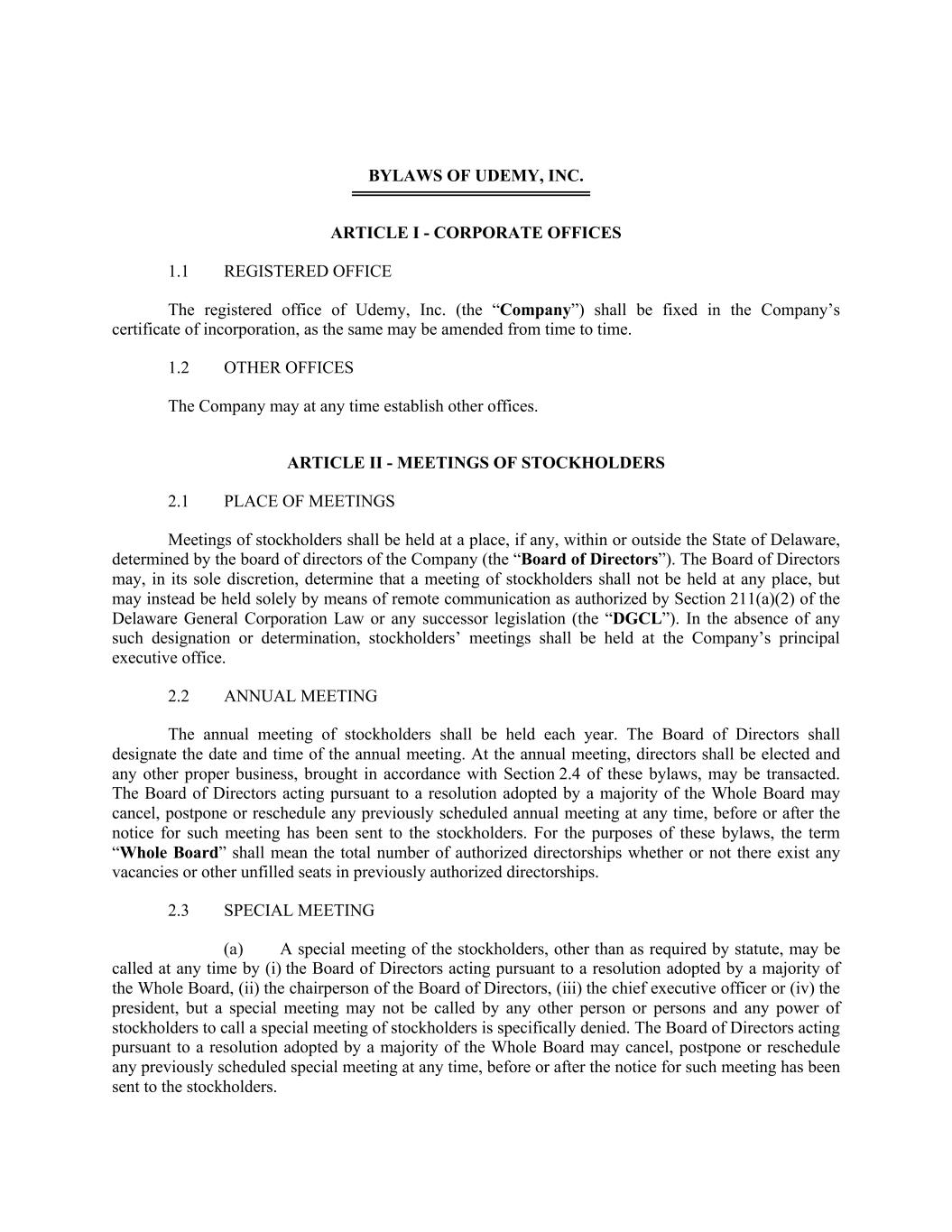 BYLAWS OF UDEMY, INC. ARTICLE I - CORPORATE OFFICES 1.1 REGISTERED OFFICE The registered office of Udemy, Inc. (the “Company”) shall be fixed in the Company’s certificate of incorporation, as the same may be amended from time to time. 1.2 OTHER OFFICES The Company may at any time establish other offices. ARTICLE II - MEETINGS OF STOCKHOLDERS 2.1 PLACE OF MEETINGS Meetings of stockholders shall be held at a place, if any, within or outside the State of Delaware, determined by the board of directors of the Company (the “Board of Directors”). The Board of Directors may, in its sole discretion, determine that a meeting of stockholders shall not be held at any place, but may instead be held solely by means of remote communication as authorized by Section 211(a)(2) of the Delaware General Corporation Law or any successor legislation (the “DGCL”). In the absence of any such designation or determination, stockholders’ meetings shall be held at the Company’s principal executive office. 2.2 ANNUAL MEETING The annual meeting of stockholders shall be held each year. The Board of Directors shall designate the date and time of the annual meeting. At the annual meeting, directors shall be elected and any other proper business, brought in accordance with Section 2.4 of these bylaws, may be transacted. The Board of Directors acting pursuant to a resolution adopted by a majority of the Whole Board may cancel, postpone or reschedule any previously scheduled annual meeting at any time, before or after the notice for such meeting has been sent to the stockholders. For the purposes of these bylaws, the term “Whole Board” shall mean the total number of authorized directorships whether or not there exist any vacancies or other unfilled seats in previously authorized directorships. 2.3 SPECIAL MEETING A special meeting of the stockholders, other than as required by statute, may be called at any time by (i) the Board of Directors acting pursuant to a resolution adopted by a majority of the Whole Board, (ii) the chairperson of the Board of Directors, (iii) the chief executive officer or (iv) the president, but a special meeting may not be called by any other person or persons and any power of stockholders to call a special meeting of stockholders is specifically denied. The Board of Directors acting pursuant to a resolution adopted by a majority of the Whole Board may cancel, postpone or reschedule any previously scheduled special meeting at any time, before or after the notice for such meeting has been sent to the stockholders.