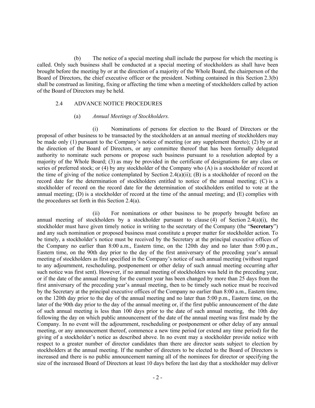 - 2 - The notice of a special meeting shall include the purpose for which the meeting is called. Only such business shall be conducted at a special meeting of stockholders as shall have been brought before the meeting by or at the direction of a majority of the Whole Board, the chairperson of the Board of Directors, the chief executive officer or the president. Nothing contained in this Section 2.3(b) shall be construed as limiting, fixing or affecting the time when a meeting of stockholders called by action of the Board of Directors may be held. 2.4 ADVANCE NOTICE PROCEDURES Annual Meetings of Stockholders. (i) Nominations of persons for election to the Board of Directors or the proposal of other business to be transacted by the stockholders at an annual meeting of stockholders may be made only (1) pursuant to the Company’s notice of meeting (or any supplement thereto); (2) by or at the direction of the Board of Directors, or any committee thereof that has been formally delegated authority to nominate such persons or propose such business pursuant to a resolution adopted by a majority of the Whole Board; (3) as may be provided in the certificate of designations for any class or series of preferred stock; or (4) by any stockholder of the Company who (A) is a stockholder of record at the time of giving of the notice contemplated by Section 2.4(a)(ii); (B) is a stockholder of record on the record date for the determination of stockholders entitled to notice of the annual meeting; (C) is a stockholder of record on the record date for the determination of stockholders entitled to vote at the annual meeting; (D) is a stockholder of record at the time of the annual meeting; and (E) complies with the procedures set forth in this Section 2.4(a). (ii) For nominations or other business to be properly brought before an annual meeting of stockholders by a stockholder pursuant to clause (4) of Section 2.4(a)(i), the stockholder must have given timely notice in writing to the secretary of the Company (the “Secretary”) and any such nomination or proposed business must constitute a proper matter for stockholder action. To be timely, a stockholder’s notice must be received by the Secretary at the principal executive offices of the Company no earlier than 8:00 a.m., Eastern time, on the 120th day and no later than 5:00 p.m., Eastern time, on the 90th day prior to the day of the first anniversary of the preceding year’s annual meeting of stockholders as first specified in the Company’s notice of such annual meeting (without regard to any adjournment, rescheduling, postponement or other delay of such annual meeting occurring after such notice was first sent). However, if no annual meeting of stockholders was held in the preceding year, or if the date of the annual meeting for the current year has been changed by more than 25 days from the first anniversary of the preceding year’s annual meeting, then to be timely such notice must be received by the Secretary at the principal executive offices of the Company no earlier than 8:00 a.m., Eastern time, on the 120th day prior to the day of the annual meeting and no later than 5:00 p.m., Eastern time, on the later of the 90th day prior to the day of the annual meeting or, if the first public announcement of the date of such annual meeting is less than 100 days prior to the date of such annual meeting, the 10th day following the day on which public announcement of the date of the annual meeting was first made by the Company. In no event will the adjournment, rescheduling or postponement or other delay of any annual meeting, or any announcement thereof, commence a new time period (or extend any time period) for the giving of a stockholder’s notice as described above. In no event may a stockholder provide notice with respect to a greater number of director candidates than there are director seats subject to election by stockholders at the annual meeting. If the number of directors to be elected to the Board of Directors is increased and there is no public announcement naming all of the nominees for director or specifying the size of the increased Board of Directors at least 10 days before the last day that a stockholder may deliver