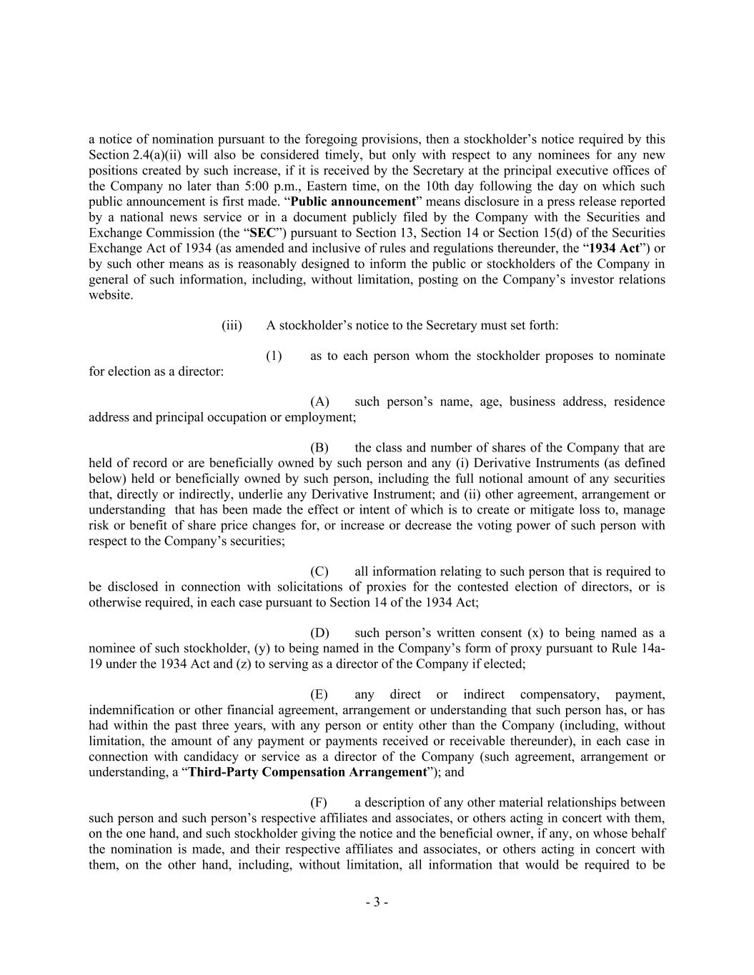 - 3 - a notice of nomination pursuant to the foregoing provisions, then a stockholder’s notice required by this Section 2.4(a)(ii) will also be considered timely, but only with respect to any nominees for any new positions created by such increase, if it is received by the Secretary at the principal executive offices of the Company no later than 5:00 p.m., Eastern time, on the 10th day following the day on which such public announcement is first made. “Public announcement” means disclosure in a press release reported by a national news service or in a document publicly filed by the Company with the Securities and Exchange Commission (the “SEC”) pursuant to Section 13, Section 14 or Section 15(d) of the Securities Exchange Act of 1934 (as amended and inclusive of rules and regulations thereunder, the “1934 Act”) or by such other means as is reasonably designed to inform the public or stockholders of the Company in general of such information, including, without limitation, posting on the Company’s investor relations website. (iii) A stockholder’s notice to the Secretary must set forth: (1) as to each person whom the stockholder proposes to nominate for election as a director: (A) such person’s name, age, business address, residence address and principal occupation or employment; (B) the class and number of shares of the Company that are held of record or are beneficially owned by such person and any (i) Derivative Instruments (as defined below) held or beneficially owned by such person, including the full notional amount of any securities that, directly or indirectly, underlie any Derivative Instrument; and (ii) other agreement, arrangement or understanding that has been made the effect or intent of which is to create or mitigate loss to, manage risk or benefit of share price changes for, or increase or decrease the voting power of such person with respect to the Company’s securities; (C) all information relating to such person that is required to be disclosed in connection with solicitations of proxies for the contested election of directors, or is otherwise required, in each case pursuant to Section 14 of the 1934 Act; (D) such person’s written consent (x) to being named as a nominee of such stockholder, (y) to being named in the Company’s form of proxy pursuant to Rule 14a- 19 under the 1934 Act and (z) to serving as a director of the Company if elected; (E) any direct or indirect compensatory, payment, indemnification or other financial agreement, arrangement or understanding that such person has, or has had within the past three years, with any person or entity other than the Company (including, without limitation, the amount of any payment or payments received or receivable thereunder), in each case in connection with candidacy or service as a director of the Company (such agreement, arrangement or understanding, a “Third-Party Compensation Arrangement”); and (F) a description of any other material relationships between such person and such person’s respective affiliates and associates, or others acting in concert with them, on the one hand, and such stockholder giving the notice and the beneficial owner, if any, on whose behalf the nomination is made, and their respective affiliates and associates, or others acting in concert with them, on the other hand, including, without limitation, all information that would be required to be