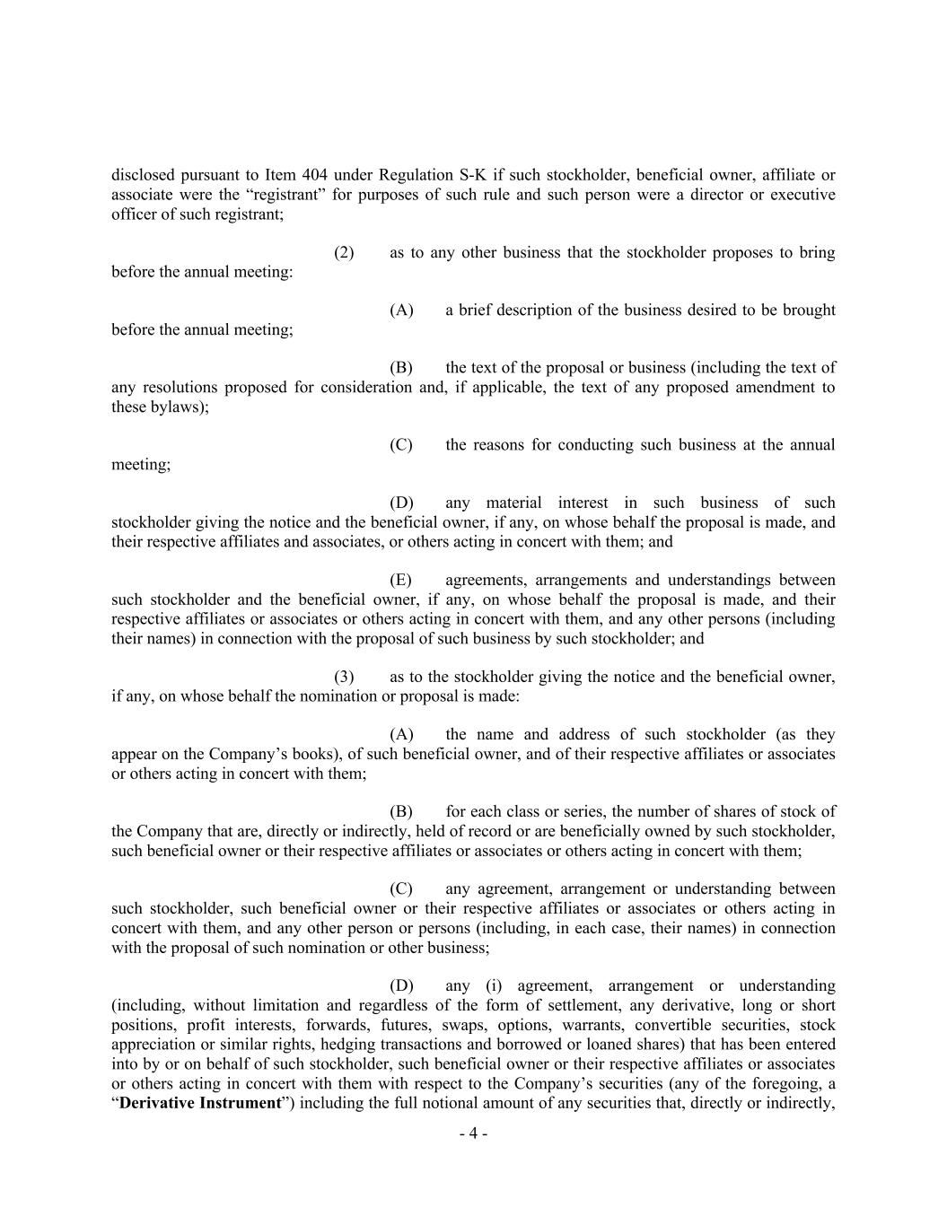 - 4 - disclosed pursuant to Item 404 under Regulation S-K if such stockholder, beneficial owner, affiliate or associate were the “registrant” for purposes of such rule and such person were a director or executive officer of such registrant; (2) as to any other business that the stockholder proposes to bring before the annual meeting: (A) a brief description of the business desired to be brought before the annual meeting; (B) the text of the proposal or business (including the text of any resolutions proposed for consideration and, if applicable, the text of any proposed amendment to these bylaws); (C) the reasons for conducting such business at the annual meeting; (D) any material interest in such business of such stockholder giving the notice and the beneficial owner, if any, on whose behalf the proposal is made, and their respective affiliates and associates, or others acting in concert with them; and (E) agreements, arrangements and understandings between such stockholder and the beneficial owner, if any, on whose behalf the proposal is made, and their respective affiliates or associates or others acting in concert with them, and any other persons (including their names) in connection with the proposal of such business by such stockholder; and (3) as to the stockholder giving the notice and the beneficial owner, if any, on whose behalf the nomination or proposal is made: (A) the name and address of such stockholder (as they appear on the Company’s books), of such beneficial owner, and of their respective affiliates or associates or others acting in concert with them; (B) for each class or series, the number of shares of stock of the Company that are, directly or indirectly, held of record or are beneficially owned by such stockholder, such beneficial owner or their respective affiliates or associates or others acting in concert with them; (C) any agreement, arrangement or understanding between such stockholder, such beneficial owner or their respective affiliates or associates or others acting in concert with them, and any other person or persons (including, in each case, their names) in connection with the proposal of such nomination or other business; (D) any (i) agreement, arrangement or understanding (including, without limitation and regardless of the form of settlement, any derivative, long or short positions, profit interests, forwards, futures, swaps, options, warrants, convertible securities, stock appreciation or similar rights, hedging transactions and borrowed or loaned shares) that has been entered into by or on behalf of such stockholder, such beneficial owner or their respective affiliates or associates or others acting in concert with them with respect to the Company’s securities (any of the foregoing, a “Derivative Instrument”) including the full notional amount of any securities that, directly or indirectly,