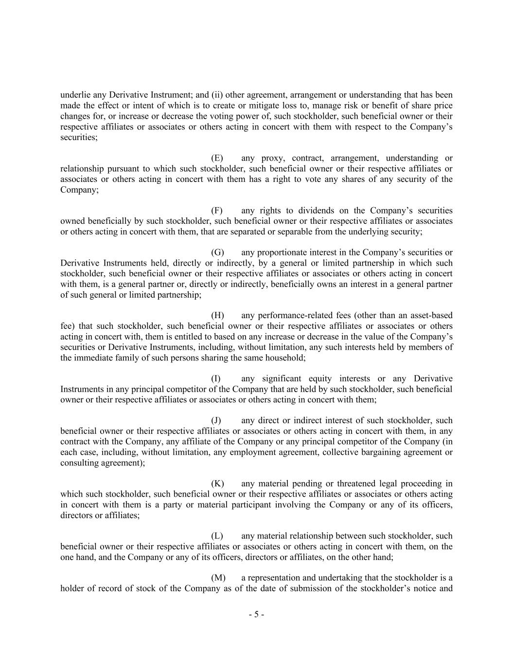 - 5 - underlie any Derivative Instrument; and (ii) other agreement, arrangement or understanding that has been made the effect or intent of which is to create or mitigate loss to, manage risk or benefit of share price changes for, or increase or decrease the voting power of, such stockholder, such beneficial owner or their respective affiliates or associates or others acting in concert with them with respect to the Company’s securities; (E) any proxy, contract, arrangement, understanding or relationship pursuant to which such stockholder, such beneficial owner or their respective affiliates or associates or others acting in concert with them has a right to vote any shares of any security of the Company; (F) any rights to dividends on the Company’s securities owned beneficially by such stockholder, such beneficial owner or their respective affiliates or associates or others acting in concert with them, that are separated or separable from the underlying security; (G) any proportionate interest in the Company’s securities or Derivative Instruments held, directly or indirectly, by a general or limited partnership in which such stockholder, such beneficial owner or their respective affiliates or associates or others acting in concert with them, is a general partner or, directly or indirectly, beneficially owns an interest in a general partner of such general or limited partnership; (H) any performance-related fees (other than an asset-based fee) that such stockholder, such beneficial owner or their respective affiliates or associates or others acting in concert with, them is entitled to based on any increase or decrease in the value of the Company’s securities or Derivative Instruments, including, without limitation, any such interests held by members of the immediate family of such persons sharing the same household; (I) any significant equity interests or any Derivative Instruments in any principal competitor of the Company that are held by such stockholder, such beneficial owner or their respective affiliates or associates or others acting in concert with them; (J) any direct or indirect interest of such stockholder, such beneficial owner or their respective affiliates or associates or others acting in concert with them, in any contract with the Company, any affiliate of the Company or any principal competitor of the Company (in each case, including, without limitation, any employment agreement, collective bargaining agreement or consulting agreement); (K) any material pending or threatened legal proceeding in which such stockholder, such beneficial owner or their respective affiliates or associates or others acting in concert with them is a party or material participant involving the Company or any of its officers, directors or affiliates; (L) any material relationship between such stockholder, such beneficial owner or their respective affiliates or associates or others acting in concert with them, on the one hand, and the Company or any of its officers, directors or affiliates, on the other hand; (M) a representation and undertaking that the stockholder is a holder of record of stock of the Company as of the date of submission of the stockholder’s notice and