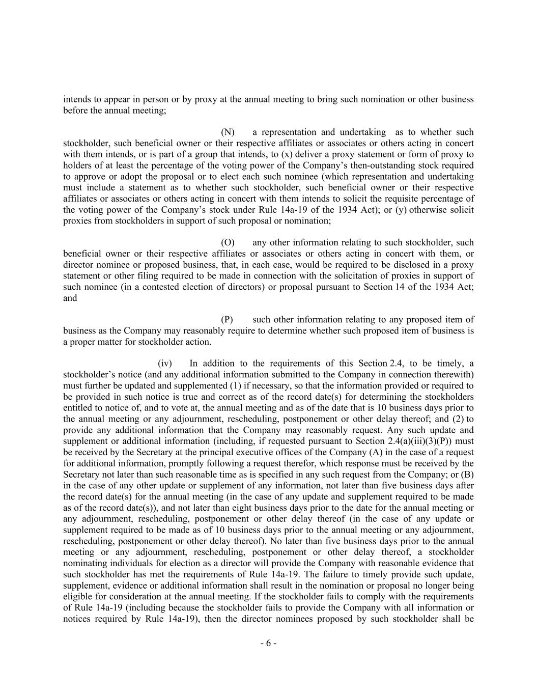 - 6 - intends to appear in person or by proxy at the annual meeting to bring such nomination or other business before the annual meeting; (N) a representation and undertaking as to whether such stockholder, such beneficial owner or their respective affiliates or associates or others acting in concert with them intends, or is part of a group that intends, to (x) deliver a proxy statement or form of proxy to holders of at least the percentage of the voting power of the Company’s then-outstanding stock required to approve or adopt the proposal or to elect each such nominee (which representation and undertaking must include a statement as to whether such stockholder, such beneficial owner or their respective affiliates or associates or others acting in concert with them intends to solicit the requisite percentage of the voting power of the Company’s stock under Rule 14a-19 of the 1934 Act); or (y) otherwise solicit proxies from stockholders in support of such proposal or nomination; (O) any other information relating to such stockholder, such beneficial owner or their respective affiliates or associates or others acting in concert with them, or director nominee or proposed business, that, in each case, would be required to be disclosed in a proxy statement or other filing required to be made in connection with the solicitation of proxies in support of such nominee (in a contested election of directors) or proposal pursuant to Section 14 of the 1934 Act; and (P) such other information relating to any proposed item of business as the Company may reasonably require to determine whether such proposed item of business is a proper matter for stockholder action. (iv) In addition to the requirements of this Section 2.4, to be timely, a stockholder’s notice (and any additional information submitted to the Company in connection therewith) must further be updated and supplemented (1) if necessary, so that the information provided or required to be provided in such notice is true and correct as of the record date(s) for determining the stockholders entitled to notice of, and to vote at, the annual meeting and as of the date that is 10 business days prior to the annual meeting or any adjournment, rescheduling, postponement or other delay thereof; and (2) to provide any additional information that the Company may reasonably request. Any such update and supplement or additional information (including, if requested pursuant to Section 2.4(a)(iii)(3)(P)) must be received by the Secretary at the principal executive offices of the Company (A) in the case of a request for additional information, promptly following a request therefor, which response must be received by the Secretary not later than such reasonable time as is specified in any such request from the Company; or (B) in the case of any other update or supplement of any information, not later than five business days after the record date(s) for the annual meeting (in the case of any update and supplement required to be made as of the record date(s)), and not later than eight business days prior to the date for the annual meeting or any adjournment, rescheduling, postponement or other delay thereof (in the case of any update or supplement required to be made as of 10 business days prior to the annual meeting or any adjournment, rescheduling, postponement or other delay thereof). No later than five business days prior to the annual meeting or any adjournment, rescheduling, postponement or other delay thereof, a stockholder nominating individuals for election as a director will provide the Company with reasonable evidence that such stockholder has met the requirements of Rule 14a-19. The failure to timely provide such update, supplement, evidence or additional information shall result in the nomination or proposal no longer being eligible for consideration at the annual meeting. If the stockholder fails to comply with the requirements of Rule 14a-19 (including because the stockholder fails to provide the Company with all information or notices required by Rule 14a-19), then the director nominees proposed by such stockholder shall be