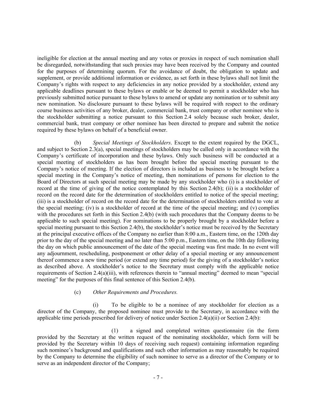 - 7 - ineligible for election at the annual meeting and any votes or proxies in respect of such nomination shall be disregarded, notwithstanding that such proxies may have been received by the Company and counted for the purposes of determining quorum. For the avoidance of doubt, the obligation to update and supplement, or provide additional information or evidence, as set forth in these bylaws shall not limit the Company’s rights with respect to any deficiencies in any notice provided by a stockholder, extend any applicable deadlines pursuant to these bylaws or enable or be deemed to permit a stockholder who has previously submitted notice pursuant to these bylaws to amend or update any nomination or to submit any new nomination. No disclosure pursuant to these bylaws will be required with respect to the ordinary course business activities of any broker, dealer, commercial bank, trust company or other nominee who is the stockholder submitting a notice pursuant to this Section 2.4 solely because such broker, dealer, commercial bank, trust company or other nominee has been directed to prepare and submit the notice required by these bylaws on behalf of a beneficial owner. Special Meetings of Stockholders. Except to the extent required by the DGCL, and subject to Section 2.3(a), special meetings of stockholders may be called only in accordance with the Company’s certificate of incorporation and these bylaws. Only such business will be conducted at a special meeting of stockholders as has been brought before the special meeting pursuant to the Company’s notice of meeting. If the election of directors is included as business to be brought before a special meeting in the Company’s notice of meeting, then nominations of persons for election to the Board of Directors at such special meeting may be made by any stockholder who (i) is a stockholder of record at the time of giving of the notice contemplated by this Section 2.4(b); (ii) is a stockholder of record on the record date for the determination of stockholders entitled to notice of the special meeting; (iii) is a stockholder of record on the record date for the determination of stockholders entitled to vote at the special meeting; (iv) is a stockholder of record at the time of the special meeting; and (v) complies with the procedures set forth in this Section 2.4(b) (with such procedures that the Company deems to be applicable to such special meeting). For nominations to be properly brought by a stockholder before a special meeting pursuant to this Section 2.4(b), the stockholder’s notice must be received by the Secretary at the principal executive offices of the Company no earlier than 8:00 a.m., Eastern time, on the 120th day prior to the day of the special meeting and no later than 5:00 p.m., Eastern time, on the 10th day following the day on which public announcement of the date of the special meeting was first made. In no event will any adjournment, rescheduling, postponement or other delay of a special meeting or any announcement thereof commence a new time period (or extend any time period) for the giving of a stockholder’s notice as described above. A stockholder’s notice to the Secretary must comply with the applicable notice requirements of Section 2.4(a)(iii), with references therein to “annual meeting” deemed to mean “special meeting” for the purposes of this final sentence of this Section 2.4(b). Other Requirements and Procedures. (i) To be eligible to be a nominee of any stockholder for election as a director of the Company, the proposed nominee must provide to the Secretary, in accordance with the applicable time periods prescribed for delivery of notice under Section 2.4(a)(ii) or Section 2.4(b): (1) a signed and completed written questionnaire (in the form provided by the Secretary at the written request of the nominating stockholder, which form will be provided by the Secretary within 10 days of receiving such request) containing information regarding such nominee’s background and qualifications and such other information as may reasonably be required by the Company to determine the eligibility of such nominee to serve as a director of the Company or to serve as an independent director of the Company;