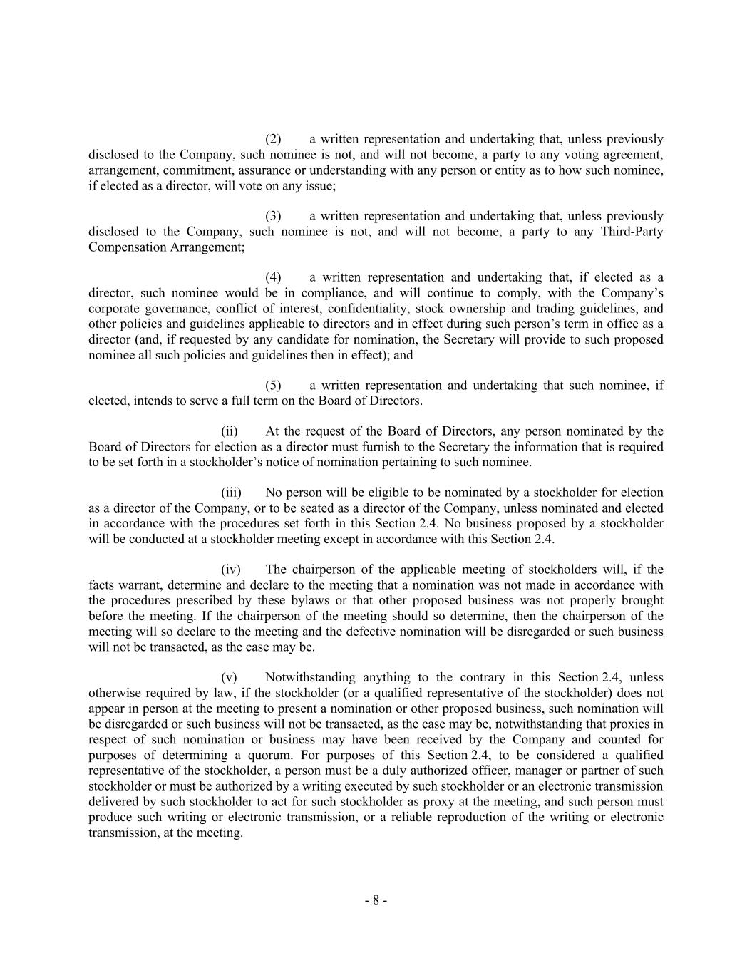 - 8 - (2) a written representation and undertaking that, unless previously disclosed to the Company, such nominee is not, and will not become, a party to any voting agreement, arrangement, commitment, assurance or understanding with any person or entity as to how such nominee, if elected as a director, will vote on any issue; (3) a written representation and undertaking that, unless previously disclosed to the Company, such nominee is not, and will not become, a party to any Third-Party Compensation Arrangement; (4) a written representation and undertaking that, if elected as a director, such nominee would be in compliance, and will continue to comply, with the Company’s corporate governance, conflict of interest, confidentiality, stock ownership and trading guidelines, and other policies and guidelines applicable to directors and in effect during such person’s term in office as a director (and, if requested by any candidate for nomination, the Secretary will provide to such proposed nominee all such policies and guidelines then in effect); and (5) a written representation and undertaking that such nominee, if elected, intends to serve a full term on the Board of Directors. (ii) At the request of the Board of Directors, any person nominated by the Board of Directors for election as a director must furnish to the Secretary the information that is required to be set forth in a stockholder’s notice of nomination pertaining to such nominee. (iii) No person will be eligible to be nominated by a stockholder for election as a director of the Company, or to be seated as a director of the Company, unless nominated and elected in accordance with the procedures set forth in this Section 2.4. No business proposed by a stockholder will be conducted at a stockholder meeting except in accordance with this Section 2.4. (iv) The chairperson of the applicable meeting of stockholders will, if the facts warrant, determine and declare to the meeting that a nomination was not made in accordance with the procedures prescribed by these bylaws or that other proposed business was not properly brought before the meeting. If the chairperson of the meeting should so determine, then the chairperson of the meeting will so declare to the meeting and the defective nomination will be disregarded or such business will not be transacted, as the case may be. (v) Notwithstanding anything to the contrary in this Section 2.4, unless otherwise required by law, if the stockholder (or a qualified representative of the stockholder) does not appear in person at the meeting to present a nomination or other proposed business, such nomination will be disregarded or such business will not be transacted, as the case may be, notwithstanding that proxies in respect of such nomination or business may have been received by the Company and counted for purposes of determining a quorum. For purposes of this Section 2.4, to be considered a qualified representative of the stockholder, a person must be a duly authorized officer, manager or partner of such stockholder or must be authorized by a writing executed by such stockholder or an electronic transmission delivered by such stockholder to act for such stockholder as proxy at the meeting, and such person must produce such writing or electronic transmission, or a reliable reproduction of the writing or electronic transmission, at the meeting.