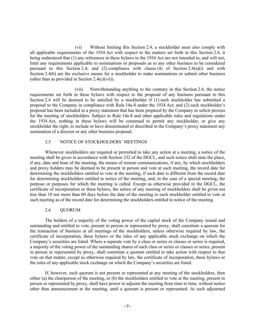 - 9 - (vi) Without limiting this Section 2.4, a stockholder must also comply with all applicable requirements of the 1934 Act with respect to the matters set forth in this Section 2.4, it being understood that (1) any references in these bylaws to the 1934 Act are not intended to, and will not, limit any requirements applicable to nominations or proposals as to any other business to be considered pursuant to this Section 2.4; and (2) compliance with clause (4) of Section 2.4(a)(i) and with Section 2.4(b) are the exclusive means for a stockholder to make nominations or submit other business (other than as provided in Section 2.4(c)(vii)). (vii) Notwithstanding anything to the contrary in this Section 2.4, the notice requirements set forth in these bylaws with respect to the proposal of any business pursuant to this Section 2.4 will be deemed to be satisfied by a stockholder if (1) such stockholder has submitted a proposal to the Company in compliance with Rule 14a-8 under the 1934 Act; and (2) such stockholder’s proposal has been included in a proxy statement that has been prepared by the Company to solicit proxies for the meeting of stockholders. Subject to Rule 14a-8 and other applicable rules and regulations under the 1934 Act, nothing in these bylaws will be construed to permit any stockholder, or give any stockholder the right, to include or have disseminated or described in the Company’s proxy statement any nomination of a director or any other business proposal. 2.5 NOTICE OF STOCKHOLDERS’ MEETINGS Whenever stockholders are required or permitted to take any action at a meeting, a notice of the meeting shall be given in accordance with Section 232 of the DGCL, and such notice shall state the place, if any, date and hour of the meeting, the means of remote communications, if any, by which stockholders and proxy holders may be deemed to be present in person and vote at such meeting, the record date for determining the stockholders entitled to vote at the meeting, if such date is different from the record date for determining stockholders entitled to notice of the meeting, and, in the case of a special meeting, the purpose or purposes for which the meeting is called. Except as otherwise provided in the DGCL, the certificate of incorporation or these bylaws, the notice of any meeting of stockholders shall be given not less than 10 nor more than 60 days before the date of the meeting to each stockholder entitled to vote at such meeting as of the record date for determining the stockholders entitled to notice of the meeting. 2.6 QUORUM The holders of a majority of the voting power of the capital stock of the Company issued and outstanding and entitled to vote, present in person or represented by proxy, shall constitute a quorum for the transaction of business at all meetings of the stockholders, unless otherwise required by law, the certificate of incorporation, these bylaws or the rules of any applicable stock exchange on which the Company’s securities are listed. Where a separate vote by a class or series or classes or series is required, a majority of the voting power of the outstanding shares of such class or series or classes or series, present in person or represented by proxy, shall constitute a quorum entitled to take action with respect to that vote on that matter, except as otherwise required by law, the certificate of incorporation, these bylaws or the rules of any applicable stock exchange on which the Company’s securities are listed. If, however, such quorum is not present or represented at any meeting of the stockholders, then either (a) the chairperson of the meeting, or (b) the stockholders entitled to vote at the meeting, present in person or represented by proxy, shall have power to adjourn the meeting from time to time, without notice other than announcement at the meeting, until a quorum is present or represented. At such adjourned