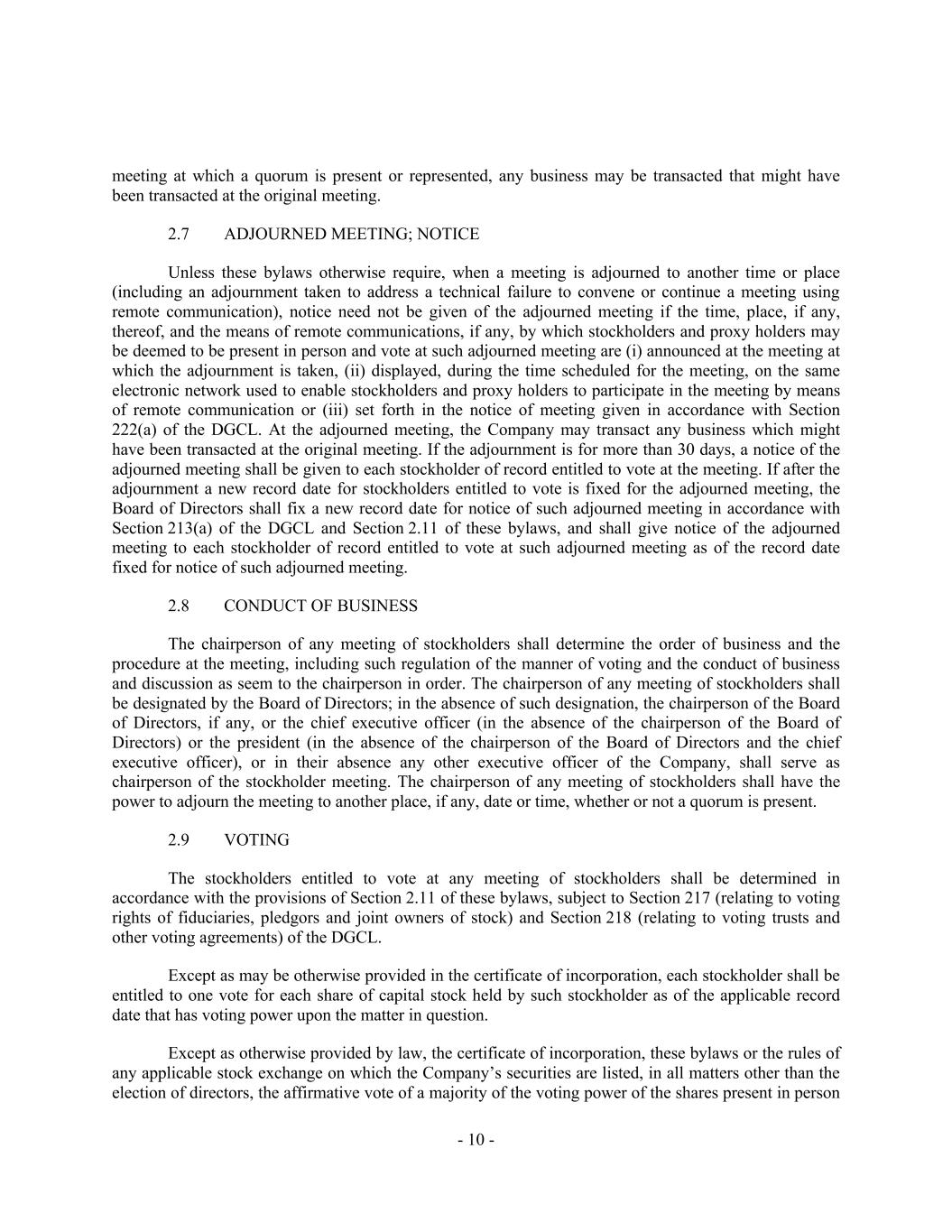 - 10 - meeting at which a quorum is present or represented, any business may be transacted that might have been transacted at the original meeting. 2.7 ADJOURNED MEETING; NOTICE Unless these bylaws otherwise require, when a meeting is adjourned to another time or place (including an adjournment taken to address a technical failure to convene or continue a meeting using remote communication), notice need not be given of the adjourned meeting if the time, place, if any, thereof, and the means of remote communications, if any, by which stockholders and proxy holders may be deemed to be present in person and vote at such adjourned meeting are (i) announced at the meeting at which the adjournment is taken, (ii) displayed, during the time scheduled for the meeting, on the same electronic network used to enable stockholders and proxy holders to participate in the meeting by means of remote communication or (iii) set forth in the notice of meeting given in accordance with Section 222(a) of the DGCL. At the adjourned meeting, the Company may transact any business which might have been transacted at the original meeting. If the adjournment is for more than 30 days, a notice of the adjourned meeting shall be given to each stockholder of record entitled to vote at the meeting. If after the adjournment a new record date for stockholders entitled to vote is fixed for the adjourned meeting, the Board of Directors shall fix a new record date for notice of such adjourned meeting in accordance with Section 213(a) of the DGCL and Section 2.11 of these bylaws, and shall give notice of the adjourned meeting to each stockholder of record entitled to vote at such adjourned meeting as of the record date fixed for notice of such adjourned meeting. 2.8 CONDUCT OF BUSINESS The chairperson of any meeting of stockholders shall determine the order of business and the procedure at the meeting, including such regulation of the manner of voting and the conduct of business and discussion as seem to the chairperson in order. The chairperson of any meeting of stockholders shall be designated by the Board of Directors; in the absence of such designation, the chairperson of the Board of Directors, if any, or the chief executive officer (in the absence of the chairperson of the Board of Directors) or the president (in the absence of the chairperson of the Board of Directors and the chief executive officer), or in their absence any other executive officer of the Company, shall serve as chairperson of the stockholder meeting. The chairperson of any meeting of stockholders shall have the power to adjourn the meeting to another place, if any, date or time, whether or not a quorum is present. 2.9 VOTING The stockholders entitled to vote at any meeting of stockholders shall be determined in accordance with the provisions of Section 2.11 of these bylaws, subject to Section 217 (relating to voting rights of fiduciaries, pledgors and joint owners of stock) and Section 218 (relating to voting trusts and other voting agreements) of the DGCL. Except as may be otherwise provided in the certificate of incorporation, each stockholder shall be entitled to one vote for each share of capital stock held by such stockholder as of the applicable record date that has voting power upon the matter in question. Except as otherwise provided by law, the certificate of incorporation, these bylaws or the rules of any applicable stock exchange on which the Company’s securities are listed, in all matters other than the election of directors, the affirmative vote of a majority of the voting power of the shares present in person