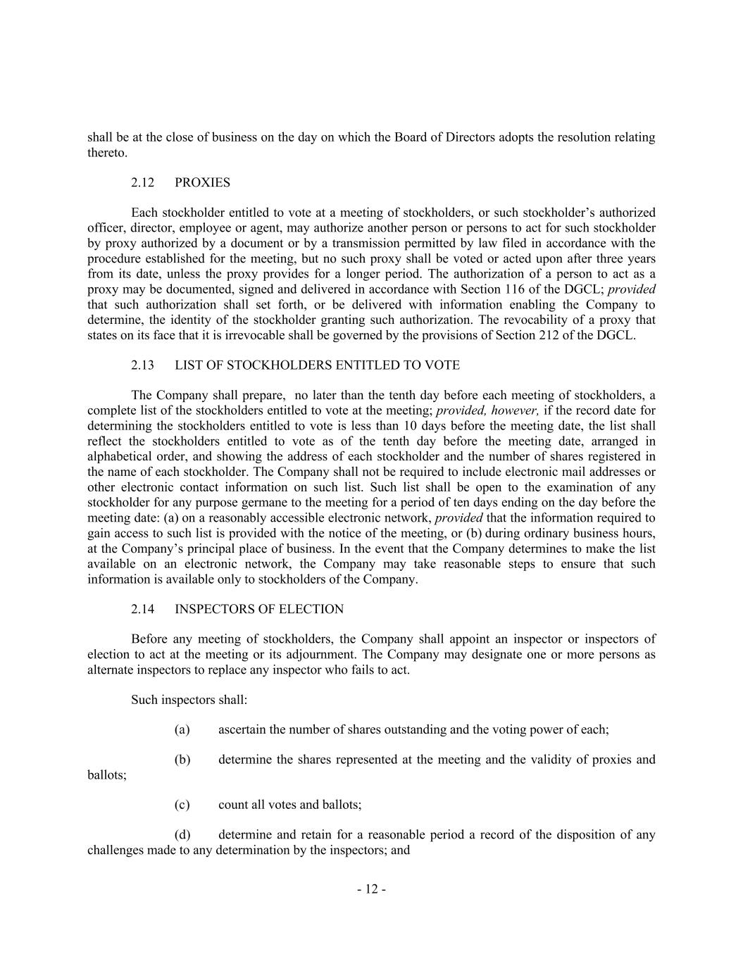 - 12 - shall be at the close of business on the day on which the Board of Directors adopts the resolution relating thereto. 2.12 PROXIES Each stockholder entitled to vote at a meeting of stockholders, or such stockholder’s authorized officer, director, employee or agent, may authorize another person or persons to act for such stockholder by proxy authorized by a document or by a transmission permitted by law filed in accordance with the procedure established for the meeting, but no such proxy shall be voted or acted upon after three years from its date, unless the proxy provides for a longer period. The authorization of a person to act as a proxy may be documented, signed and delivered in accordance with Section 116 of the DGCL; provided that such authorization shall set forth, or be delivered with information enabling the Company to determine, the identity of the stockholder granting such authorization. The revocability of a proxy that states on its face that it is irrevocable shall be governed by the provisions of Section 212 of the DGCL. 2.13 LIST OF STOCKHOLDERS ENTITLED TO VOTE The Company shall prepare, no later than the tenth day before each meeting of stockholders, a complete list of the stockholders entitled to vote at the meeting; provided, however, if the record date for determining the stockholders entitled to vote is less than 10 days before the meeting date, the list shall reflect the stockholders entitled to vote as of the tenth day before the meeting date, arranged in alphabetical order, and showing the address of each stockholder and the number of shares registered in the name of each stockholder. The Company shall not be required to include electronic mail addresses or other electronic contact information on such list. Such list shall be open to the examination of any stockholder for any purpose germane to the meeting for a period of ten days ending on the day before the meeting date: (a) on a reasonably accessible electronic network, provided that the information required to gain access to such list is provided with the notice of the meeting, or (b) during ordinary business hours, at the Company’s principal place of business. In the event that the Company determines to make the list available on an electronic network, the Company may take reasonable steps to ensure that such information is available only to stockholders of the Company. 2.14 INSPECTORS OF ELECTION Before any meeting of stockholders, the Company shall appoint an inspector or inspectors of election to act at the meeting or its adjournment. The Company may designate one or more persons as alternate inspectors to replace any inspector who fails to act. Such inspectors shall: ascertain the number of shares outstanding and the voting power of each; determine the shares represented at the meeting and the validity of proxies and ballots; count all votes and ballots; determine and retain for a reasonable period a record of the disposition of any challenges made to any determination by the inspectors; and