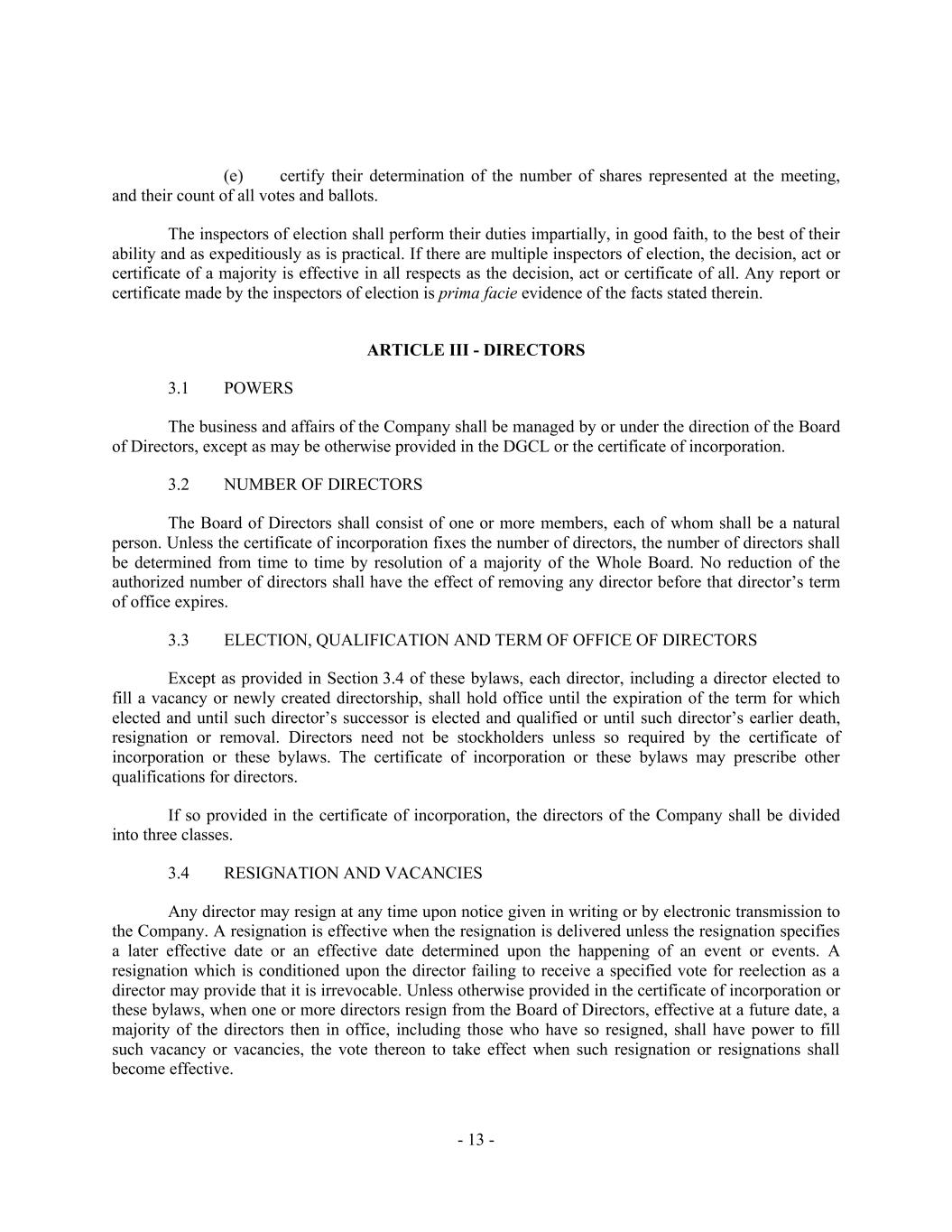 - 13 - certify their determination of the number of shares represented at the meeting, and their count of all votes and ballots. The inspectors of election shall perform their duties impartially, in good faith, to the best of their ability and as expeditiously as is practical. If there are multiple inspectors of election, the decision, act or certificate of a majority is effective in all respects as the decision, act or certificate of all. Any report or certificate made by the inspectors of election is prima facie evidence of the facts stated therein. ARTICLE III - DIRECTORS 3.1 POWERS The business and affairs of the Company shall be managed by or under the direction of the Board of Directors, except as may be otherwise provided in the DGCL or the certificate of incorporation. 3.2 NUMBER OF DIRECTORS The Board of Directors shall consist of one or more members, each of whom shall be a natural person. Unless the certificate of incorporation fixes the number of directors, the number of directors shall be determined from time to time by resolution of a majority of the Whole Board. No reduction of the authorized number of directors shall have the effect of removing any director before that director’s term of office expires. 3.3 ELECTION, QUALIFICATION AND TERM OF OFFICE OF DIRECTORS Except as provided in Section 3.4 of these bylaws, each director, including a director elected to fill a vacancy or newly created directorship, shall hold office until the expiration of the term for which elected and until such director’s successor is elected and qualified or until such director’s earlier death, resignation or removal. Directors need not be stockholders unless so required by the certificate of incorporation or these bylaws. The certificate of incorporation or these bylaws may prescribe other qualifications for directors. If so provided in the certificate of incorporation, the directors of the Company shall be divided into three classes. 3.4 RESIGNATION AND VACANCIES Any director may resign at any time upon notice given in writing or by electronic transmission to the Company. A resignation is effective when the resignation is delivered unless the resignation specifies a later effective date or an effective date determined upon the happening of an event or events. A resignation which is conditioned upon the director failing to receive a specified vote for reelection as a director may provide that it is irrevocable. Unless otherwise provided in the certificate of incorporation or these bylaws, when one or more directors resign from the Board of Directors, effective at a future date, a majority of the directors then in office, including those who have so resigned, shall have power to fill such vacancy or vacancies, the vote thereon to take effect when such resignation or resignations shall become effective.