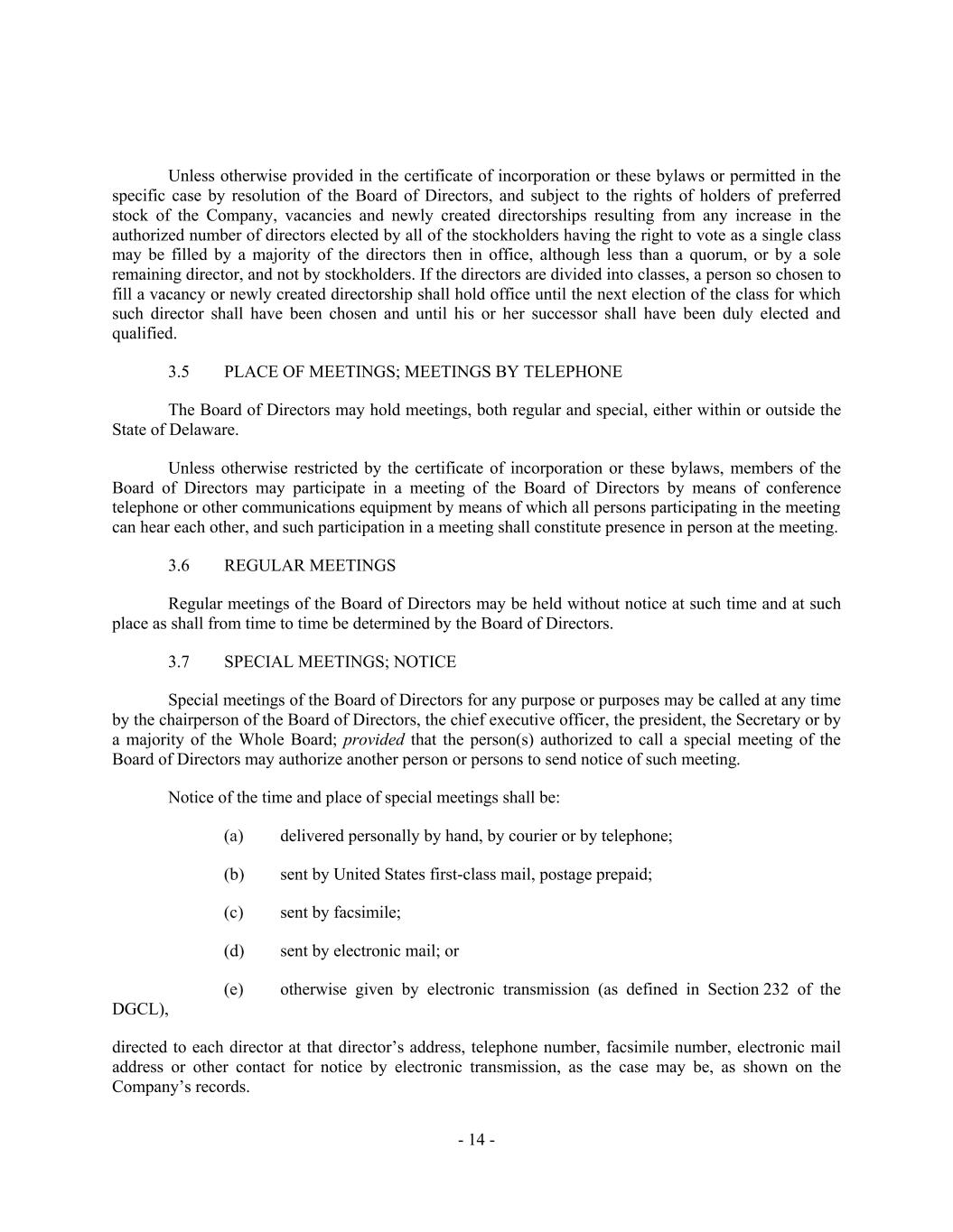 - 14 - Unless otherwise provided in the certificate of incorporation or these bylaws or permitted in the specific case by resolution of the Board of Directors, and subject to the rights of holders of preferred stock of the Company, vacancies and newly created directorships resulting from any increase in the authorized number of directors elected by all of the stockholders having the right to vote as a single class may be filled by a majority of the directors then in office, although less than a quorum, or by a sole remaining director, and not by stockholders. If the directors are divided into classes, a person so chosen to fill a vacancy or newly created directorship shall hold office until the next election of the class for which such director shall have been chosen and until his or her successor shall have been duly elected and qualified. 3.5 PLACE OF MEETINGS; MEETINGS BY TELEPHONE The Board of Directors may hold meetings, both regular and special, either within or outside the State of Delaware. Unless otherwise restricted by the certificate of incorporation or these bylaws, members of the Board of Directors may participate in a meeting of the Board of Directors by means of conference telephone or other communications equipment by means of which all persons participating in the meeting can hear each other, and such participation in a meeting shall constitute presence in person at the meeting. 3.6 REGULAR MEETINGS Regular meetings of the Board of Directors may be held without notice at such time and at such place as shall from time to time be determined by the Board of Directors. 3.7 SPECIAL MEETINGS; NOTICE Special meetings of the Board of Directors for any purpose or purposes may be called at any time by the chairperson of the Board of Directors, the chief executive officer, the president, the Secretary or by a majority of the Whole Board; provided that the person(s) authorized to call a special meeting of the Board of Directors may authorize another person or persons to send notice of such meeting. Notice of the time and place of special meetings shall be: delivered personally by hand, by courier or by telephone; sent by United States first-class mail, postage prepaid; sent by facsimile; sent by electronic mail; or otherwise given by electronic transmission (as defined in Section 232 of the DGCL), directed to each director at that director’s address, telephone number, facsimile number, electronic mail address or other contact for notice by electronic transmission, as the case may be, as shown on the Company’s records.
