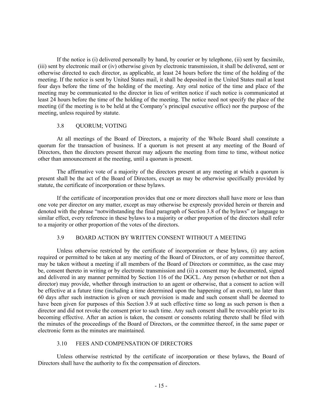 - 15 - If the notice is (i) delivered personally by hand, by courier or by telephone, (ii) sent by facsimile, (iii) sent by electronic mail or (iv) otherwise given by electronic transmission, it shall be delivered, sent or otherwise directed to each director, as applicable, at least 24 hours before the time of the holding of the meeting. If the notice is sent by United States mail, it shall be deposited in the United States mail at least four days before the time of the holding of the meeting. Any oral notice of the time and place of the meeting may be communicated to the director in lieu of written notice if such notice is communicated at least 24 hours before the time of the holding of the meeting. The notice need not specify the place of the meeting (if the meeting is to be held at the Company’s principal executive office) nor the purpose of the meeting, unless required by statute. 3.8 QUORUM; VOTING At all meetings of the Board of Directors, a majority of the Whole Board shall constitute a quorum for the transaction of business. If a quorum is not present at any meeting of the Board of Directors, then the directors present thereat may adjourn the meeting from time to time, without notice other than announcement at the meeting, until a quorum is present. The affirmative vote of a majority of the directors present at any meeting at which a quorum is present shall be the act of the Board of Directors, except as may be otherwise specifically provided by statute, the certificate of incorporation or these bylaws. If the certificate of incorporation provides that one or more directors shall have more or less than one vote per director on any matter, except as may otherwise be expressly provided herein or therein and denoted with the phrase “notwithstanding the final paragraph of Section 3.8 of the bylaws” or language to similar effect, every reference in these bylaws to a majority or other proportion of the directors shall refer to a majority or other proportion of the votes of the directors. 3.9 BOARD ACTION BY WRITTEN CONSENT WITHOUT A MEETING Unless otherwise restricted by the certificate of incorporation or these bylaws, (i) any action required or permitted to be taken at any meeting of the Board of Directors, or of any committee thereof, may be taken without a meeting if all members of the Board of Directors or committee, as the case may be, consent thereto in writing or by electronic transmission and (ii) a consent may be documented, signed and delivered in any manner permitted by Section 116 of the DGCL. Any person (whether or not then a director) may provide, whether through instruction to an agent or otherwise, that a consent to action will be effective at a future time (including a time determined upon the happening of an event), no later than 60 days after such instruction is given or such provision is made and such consent shall be deemed to have been given for purposes of this Section 3.9 at such effective time so long as such person is then a director and did not revoke the consent prior to such time. Any such consent shall be revocable prior to its becoming effective. After an action is taken, the consent or consents relating thereto shall be filed with the minutes of the proceedings of the Board of Directors, or the committee thereof, in the same paper or electronic form as the minutes are maintained. 3.10 FEES AND COMPENSATION OF DIRECTORS Unless otherwise restricted by the certificate of incorporation or these bylaws, the Board of Directors shall have the authority to fix the compensation of directors.