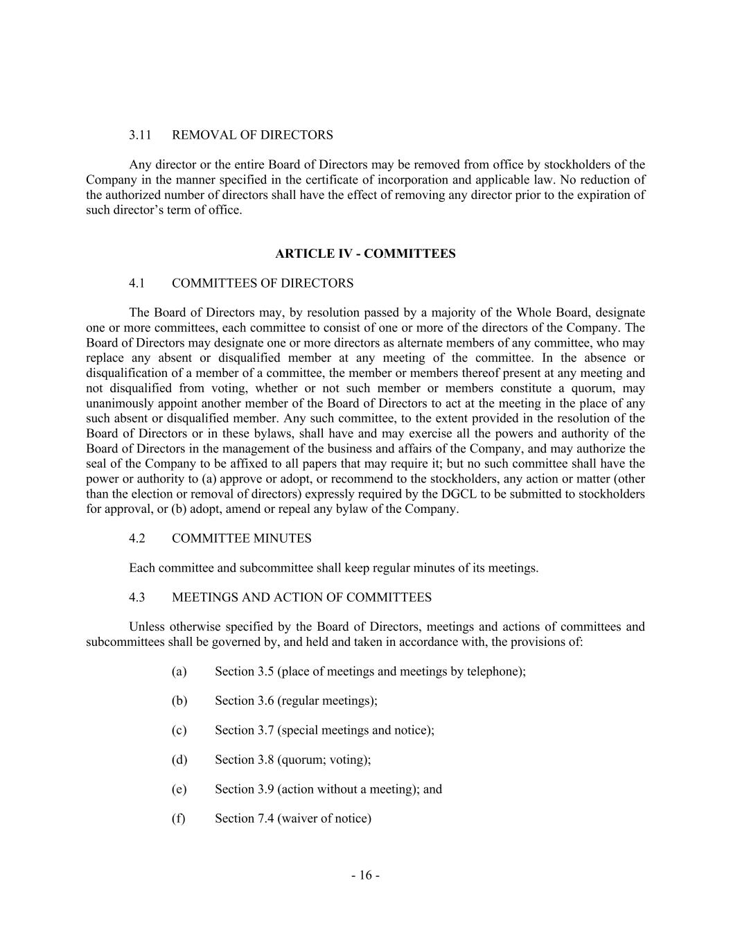 - 16 - 3.11 REMOVAL OF DIRECTORS Any director or the entire Board of Directors may be removed from office by stockholders of the Company in the manner specified in the certificate of incorporation and applicable law. No reduction of the authorized number of directors shall have the effect of removing any director prior to the expiration of such director’s term of office. ARTICLE IV - COMMITTEES 4.1 COMMITTEES OF DIRECTORS The Board of Directors may, by resolution passed by a majority of the Whole Board, designate one or more committees, each committee to consist of one or more of the directors of the Company. The Board of Directors may designate one or more directors as alternate members of any committee, who may replace any absent or disqualified member at any meeting of the committee. In the absence or disqualification of a member of a committee, the member or members thereof present at any meeting and not disqualified from voting, whether or not such member or members constitute a quorum, may unanimously appoint another member of the Board of Directors to act at the meeting in the place of any such absent or disqualified member. Any such committee, to the extent provided in the resolution of the Board of Directors or in these bylaws, shall have and may exercise all the powers and authority of the Board of Directors in the management of the business and affairs of the Company, and may authorize the seal of the Company to be affixed to all papers that may require it; but no such committee shall have the power or authority to (a) approve or adopt, or recommend to the stockholders, any action or matter (other than the election or removal of directors) expressly required by the DGCL to be submitted to stockholders for approval, or (b) adopt, amend or repeal any bylaw of the Company. 4.2 COMMITTEE MINUTES Each committee and subcommittee shall keep regular minutes of its meetings. 4.3 MEETINGS AND ACTION OF COMMITTEES Unless otherwise specified by the Board of Directors, meetings and actions of committees and subcommittees shall be governed by, and held and taken in accordance with, the provisions of: Section 3.5 (place of meetings and meetings by telephone); Section 3.6 (regular meetings); Section 3.7 (special meetings and notice); Section 3.8 (quorum; voting); Section 3.9 (action without a meeting); and Section 7.4 (waiver of notice)