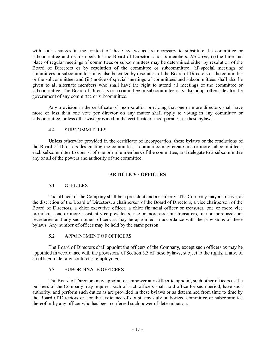 - 17 - with such changes in the context of those bylaws as are necessary to substitute the committee or subcommittee and its members for the Board of Directors and its members. However, (i) the time and place of regular meetings of committees or subcommittees may be determined either by resolution of the Board of Directors or by resolution of the committee or subcommittee; (ii) special meetings of committees or subcommittees may also be called by resolution of the Board of Directors or the committee or the subcommittee; and (iii) notice of special meetings of committees and subcommittees shall also be given to all alternate members who shall have the right to attend all meetings of the committee or subcommittee. The Board of Directors or a committee or subcommittee may also adopt other rules for the government of any committee or subcommittee. Any provision in the certificate of incorporation providing that one or more directors shall have more or less than one vote per director on any matter shall apply to voting in any committee or subcommittee, unless otherwise provided in the certificate of incorporation or these bylaws. 4.4 SUBCOMMITTEES Unless otherwise provided in the certificate of incorporation, these bylaws or the resolutions of the Board of Directors designating the committee, a committee may create one or more subcommittees, each subcommittee to consist of one or more members of the committee, and delegate to a subcommittee any or all of the powers and authority of the committee. ARTICLE V - OFFICERS 5.1 OFFICERS The officers of the Company shall be a president and a secretary. The Company may also have, at the discretion of the Board of Directors, a chairperson of the Board of Directors, a vice chairperson of the Board of Directors, a chief executive officer, a chief financial officer or treasurer, one or more vice presidents, one or more assistant vice presidents, one or more assistant treasurers, one or more assistant secretaries and any such other officers as may be appointed in accordance with the provisions of these bylaws. Any number of offices may be held by the same person. 5.2 APPOINTMENT OF OFFICERS The Board of Directors shall appoint the officers of the Company, except such officers as may be appointed in accordance with the provisions of Section 5.3 of these bylaws, subject to the rights, if any, of an officer under any contract of employment. 5.3 SUBORDINATE OFFICERS The Board of Directors may appoint, or empower any officer to appoint, such other officers as the business of the Company may require. Each of such officers shall hold office for such period, have such authority, and perform such duties as are provided in these bylaws or as determined from time to time by the Board of Directors or, for the avoidance of doubt, any duly authorized committee or subcommittee thereof or by any officer who has been conferred such power of determination.