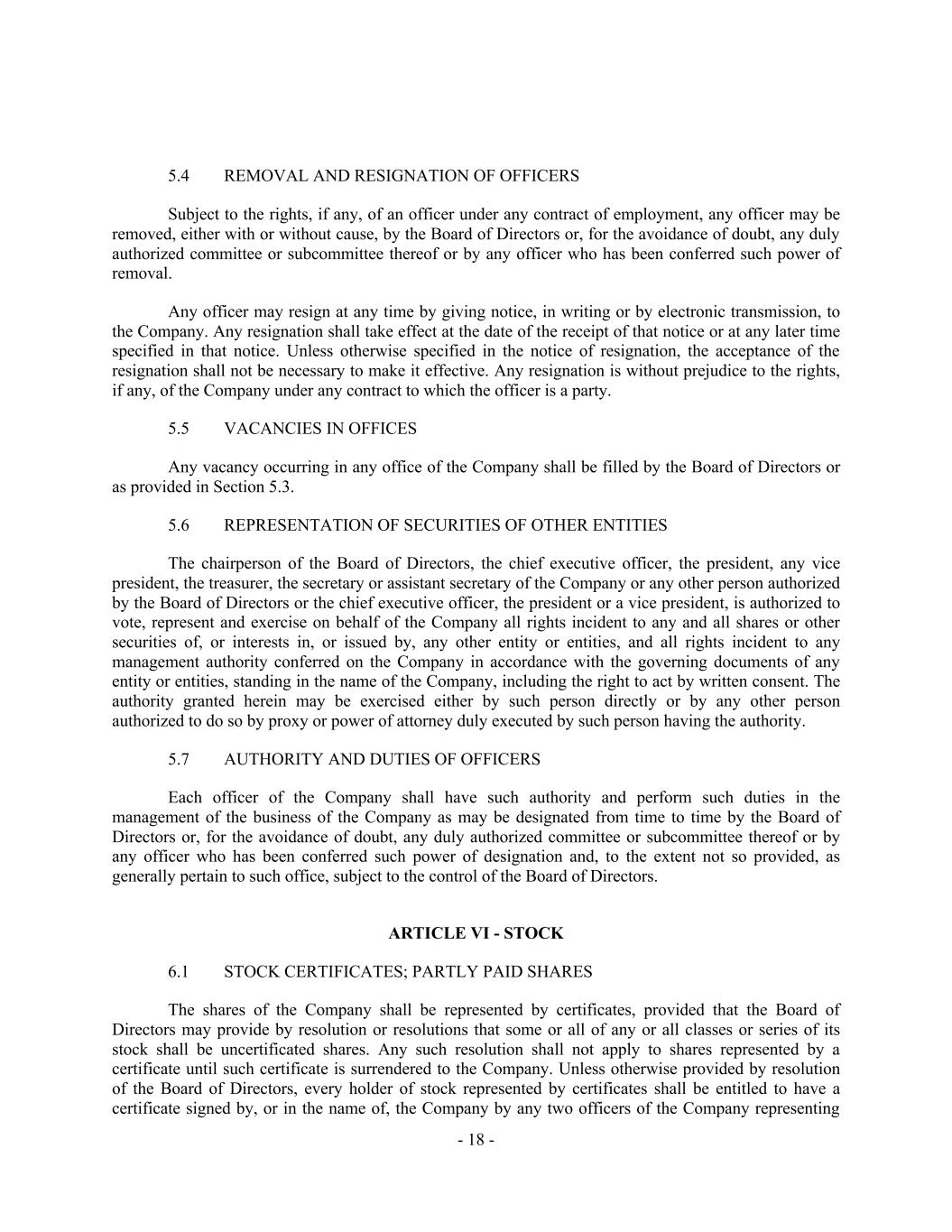 - 18 - 5.4 REMOVAL AND RESIGNATION OF OFFICERS Subject to the rights, if any, of an officer under any contract of employment, any officer may be removed, either with or without cause, by the Board of Directors or, for the avoidance of doubt, any duly authorized committee or subcommittee thereof or by any officer who has been conferred such power of removal. Any officer may resign at any time by giving notice, in writing or by electronic transmission, to the Company. Any resignation shall take effect at the date of the receipt of that notice or at any later time specified in that notice. Unless otherwise specified in the notice of resignation, the acceptance of the resignation shall not be necessary to make it effective. Any resignation is without prejudice to the rights, if any, of the Company under any contract to which the officer is a party. 5.5 VACANCIES IN OFFICES Any vacancy occurring in any office of the Company shall be filled by the Board of Directors or as provided in Section 5.3. 5.6 REPRESENTATION OF SECURITIES OF OTHER ENTITIES The chairperson of the Board of Directors, the chief executive officer, the president, any vice president, the treasurer, the secretary or assistant secretary of the Company or any other person authorized by the Board of Directors or the chief executive officer, the president or a vice president, is authorized to vote, represent and exercise on behalf of the Company all rights incident to any and all shares or other securities of, or interests in, or issued by, any other entity or entities, and all rights incident to any management authority conferred on the Company in accordance with the governing documents of any entity or entities, standing in the name of the Company, including the right to act by written consent. The authority granted herein may be exercised either by such person directly or by any other person authorized to do so by proxy or power of attorney duly executed by such person having the authority. 5.7 AUTHORITY AND DUTIES OF OFFICERS Each officer of the Company shall have such authority and perform such duties in the management of the business of the Company as may be designated from time to time by the Board of Directors or, for the avoidance of doubt, any duly authorized committee or subcommittee thereof or by any officer who has been conferred such power of designation and, to the extent not so provided, as generally pertain to such office, subject to the control of the Board of Directors. ARTICLE VI - STOCK 6.1 STOCK CERTIFICATES; PARTLY PAID SHARES The shares of the Company shall be represented by certificates, provided that the Board of Directors may provide by resolution or resolutions that some or all of any or all classes or series of its stock shall be uncertificated shares. Any such resolution shall not apply to shares represented by a certificate until such certificate is surrendered to the Company. Unless otherwise provided by resolution of the Board of Directors, every holder of stock represented by certificates shall be entitled to have a certificate signed by, or in the name of, the Company by any two officers of the Company representing