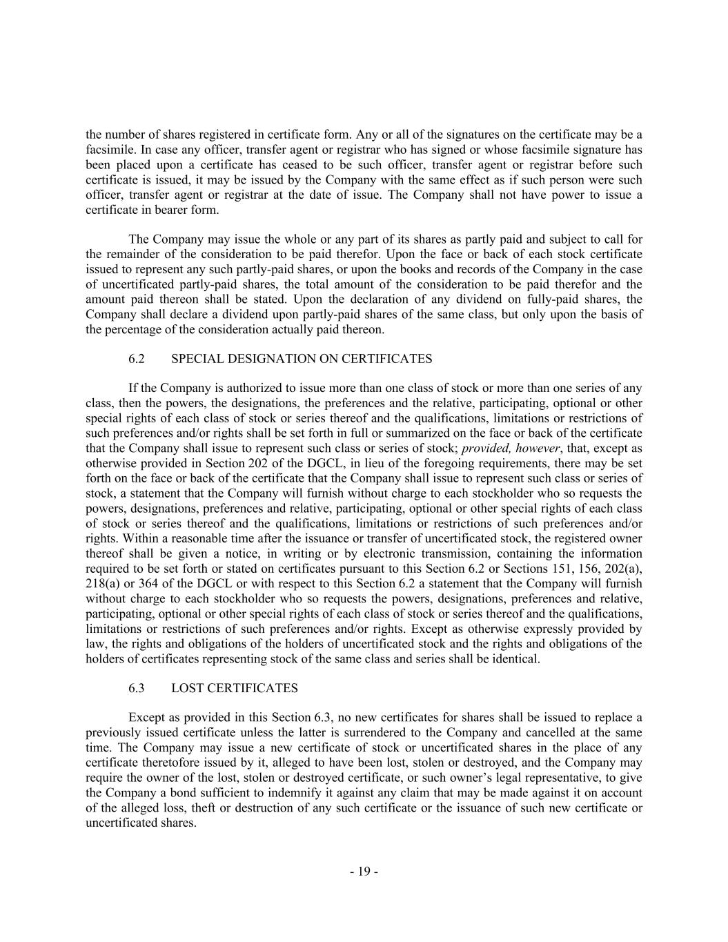 - 19 - the number of shares registered in certificate form. Any or all of the signatures on the certificate may be a facsimile. In case any officer, transfer agent or registrar who has signed or whose facsimile signature has been placed upon a certificate has ceased to be such officer, transfer agent or registrar before such certificate is issued, it may be issued by the Company with the same effect as if such person were such officer, transfer agent or registrar at the date of issue. The Company shall not have power to issue a certificate in bearer form. The Company may issue the whole or any part of its shares as partly paid and subject to call for the remainder of the consideration to be paid therefor. Upon the face or back of each stock certificate issued to represent any such partly-paid shares, or upon the books and records of the Company in the case of uncertificated partly-paid shares, the total amount of the consideration to be paid therefor and the amount paid thereon shall be stated. Upon the declaration of any dividend on fully-paid shares, the Company shall declare a dividend upon partly-paid shares of the same class, but only upon the basis of the percentage of the consideration actually paid thereon. 6.2 SPECIAL DESIGNATION ON CERTIFICATES If the Company is authorized to issue more than one class of stock or more than one series of any class, then the powers, the designations, the preferences and the relative, participating, optional or other special rights of each class of stock or series thereof and the qualifications, limitations or restrictions of such preferences and/or rights shall be set forth in full or summarized on the face or back of the certificate that the Company shall issue to represent such class or series of stock; provided, however, that, except as otherwise provided in Section 202 of the DGCL, in lieu of the foregoing requirements, there may be set forth on the face or back of the certificate that the Company shall issue to represent such class or series of stock, a statement that the Company will furnish without charge to each stockholder who so requests the powers, designations, preferences and relative, participating, optional or other special rights of each class of stock or series thereof and the qualifications, limitations or restrictions of such preferences and/or rights. Within a reasonable time after the issuance or transfer of uncertificated stock, the registered owner thereof shall be given a notice, in writing or by electronic transmission, containing the information required to be set forth or stated on certificates pursuant to this Section 6.2 or Sections 151, 156, 202(a), 218(a) or 364 of the DGCL or with respect to this Section 6.2 a statement that the Company will furnish without charge to each stockholder who so requests the powers, designations, preferences and relative, participating, optional or other special rights of each class of stock or series thereof and the qualifications, limitations or restrictions of such preferences and/or rights. Except as otherwise expressly provided by law, the rights and obligations of the holders of uncertificated stock and the rights and obligations of the holders of certificates representing stock of the same class and series shall be identical. 6.3 LOST CERTIFICATES Except as provided in this Section 6.3, no new certificates for shares shall be issued to replace a previously issued certificate unless the latter is surrendered to the Company and cancelled at the same time. The Company may issue a new certificate of stock or uncertificated shares in the place of any certificate theretofore issued by it, alleged to have been lost, stolen or destroyed, and the Company may require the owner of the lost, stolen or destroyed certificate, or such owner’s legal representative, to give the Company a bond sufficient to indemnify it against any claim that may be made against it on account of the alleged loss, theft or destruction of any such certificate or the issuance of such new certificate or uncertificated shares.