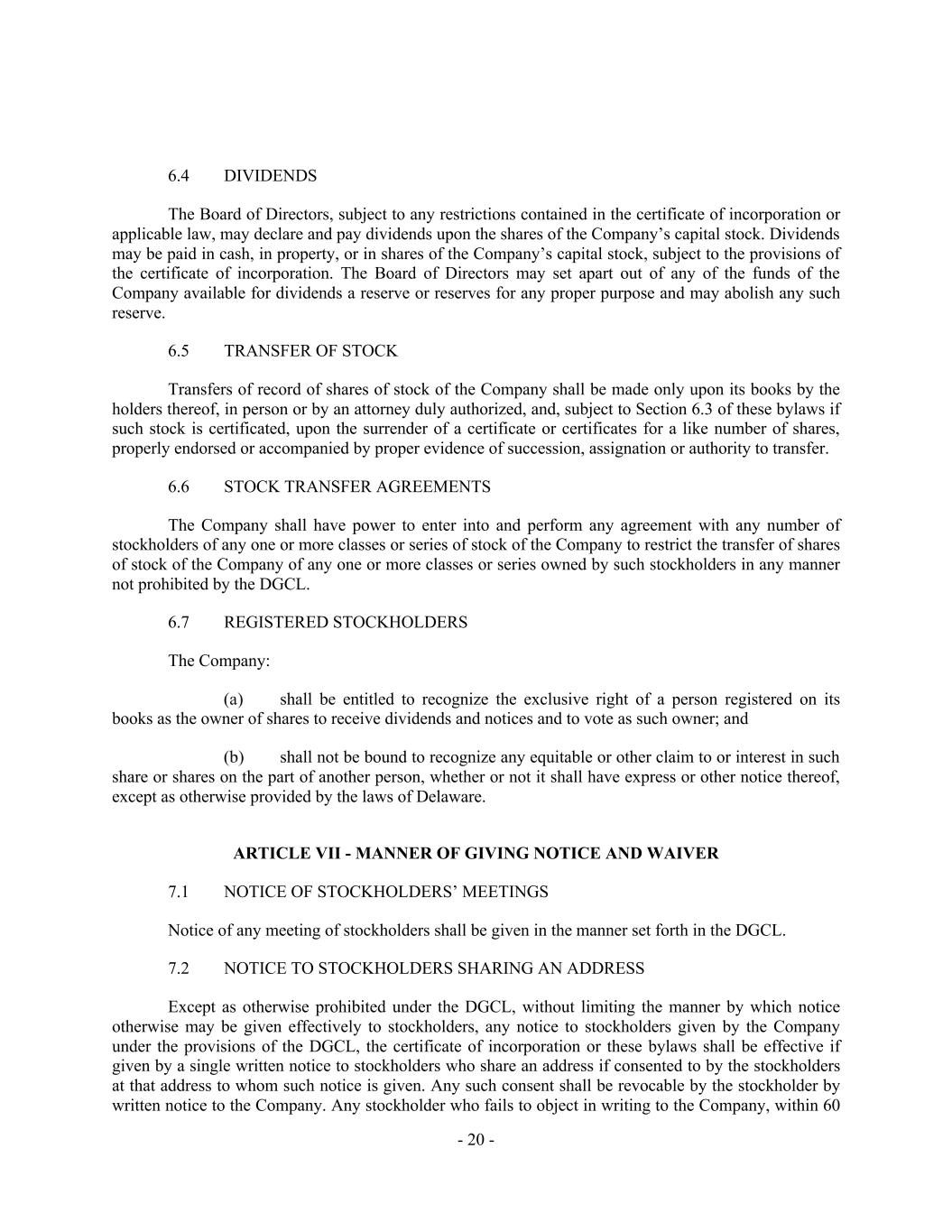 - 20 - 6.4 DIVIDENDS The Board of Directors, subject to any restrictions contained in the certificate of incorporation or applicable law, may declare and pay dividends upon the shares of the Company’s capital stock. Dividends may be paid in cash, in property, or in shares of the Company’s capital stock, subject to the provisions of the certificate of incorporation. The Board of Directors may set apart out of any of the funds of the Company available for dividends a reserve or reserves for any proper purpose and may abolish any such reserve. 6.5 TRANSFER OF STOCK Transfers of record of shares of stock of the Company shall be made only upon its books by the holders thereof, in person or by an attorney duly authorized, and, subject to Section 6.3 of these bylaws if such stock is certificated, upon the surrender of a certificate or certificates for a like number of shares, properly endorsed or accompanied by proper evidence of succession, assignation or authority to transfer. 6.6 STOCK TRANSFER AGREEMENTS The Company shall have power to enter into and perform any agreement with any number of stockholders of any one or more classes or series of stock of the Company to restrict the transfer of shares of stock of the Company of any one or more classes or series owned by such stockholders in any manner not prohibited by the DGCL. 6.7 REGISTERED STOCKHOLDERS The Company: shall be entitled to recognize the exclusive right of a person registered on its books as the owner of shares to receive dividends and notices and to vote as such owner; and shall not be bound to recognize any equitable or other claim to or interest in such share or shares on the part of another person, whether or not it shall have express or other notice thereof, except as otherwise provided by the laws of Delaware. ARTICLE VII - MANNER OF GIVING NOTICE AND WAIVER 7.1 NOTICE OF STOCKHOLDERS’ MEETINGS Notice of any meeting of stockholders shall be given in the manner set forth in the DGCL. 7.2 NOTICE TO STOCKHOLDERS SHARING AN ADDRESS Except as otherwise prohibited under the DGCL, without limiting the manner by which notice otherwise may be given effectively to stockholders, any notice to stockholders given by the Company under the provisions of the DGCL, the certificate of incorporation or these bylaws shall be effective if given by a single written notice to stockholders who share an address if consented to by the stockholders at that address to whom such notice is given. Any such consent shall be revocable by the stockholder by written notice to the Company. Any stockholder who fails to object in writing to the Company, within 60