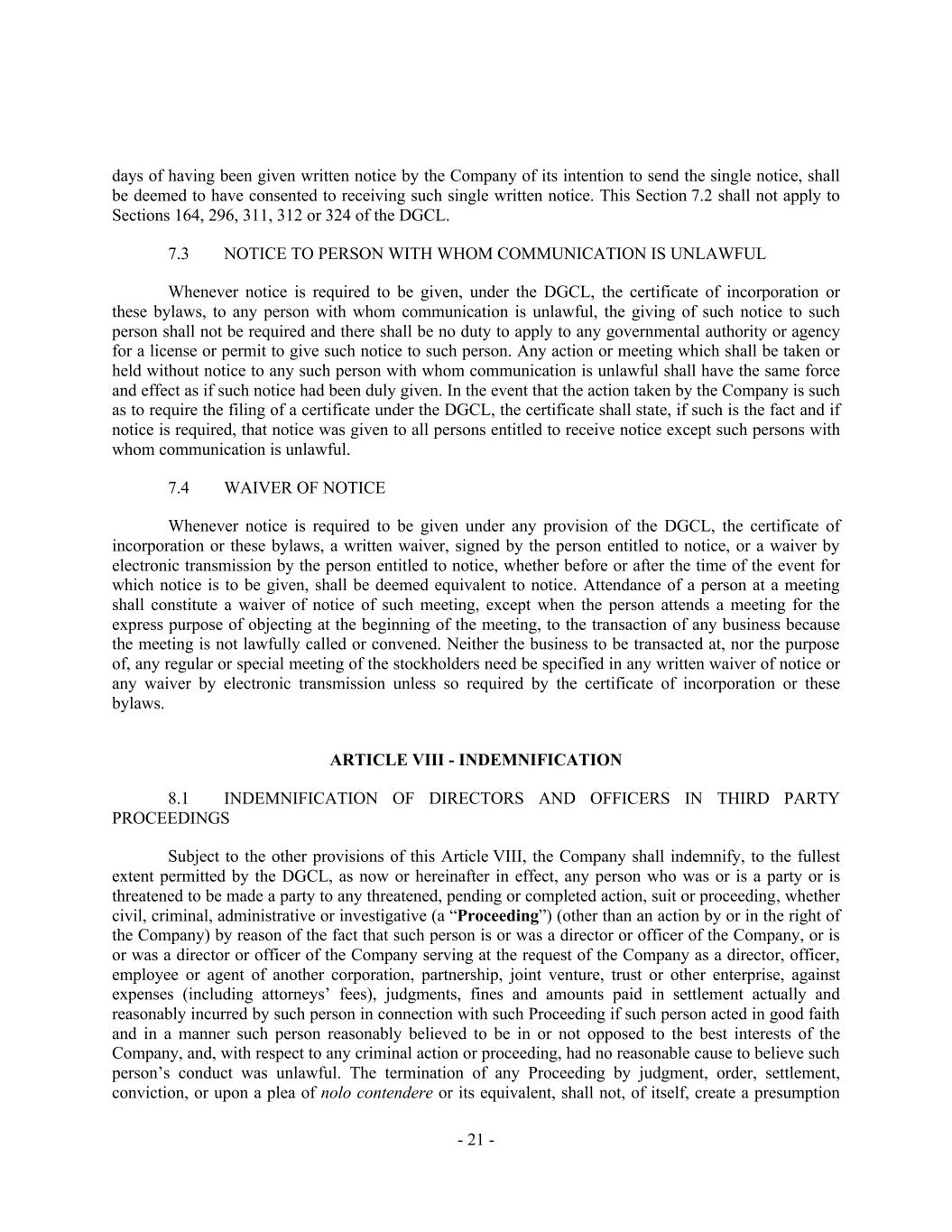 - 21 - days of having been given written notice by the Company of its intention to send the single notice, shall be deemed to have consented to receiving such single written notice. This Section 7.2 shall not apply to Sections 164, 296, 311, 312 or 324 of the DGCL. 7.3 NOTICE TO PERSON WITH WHOM COMMUNICATION IS UNLAWFUL Whenever notice is required to be given, under the DGCL, the certificate of incorporation or these bylaws, to any person with whom communication is unlawful, the giving of such notice to such person shall not be required and there shall be no duty to apply to any governmental authority or agency for a license or permit to give such notice to such person. Any action or meeting which shall be taken or held without notice to any such person with whom communication is unlawful shall have the same force and effect as if such notice had been duly given. In the event that the action taken by the Company is such as to require the filing of a certificate under the DGCL, the certificate shall state, if such is the fact and if notice is required, that notice was given to all persons entitled to receive notice except such persons with whom communication is unlawful. 7.4 WAIVER OF NOTICE Whenever notice is required to be given under any provision of the DGCL, the certificate of incorporation or these bylaws, a written waiver, signed by the person entitled to notice, or a waiver by electronic transmission by the person entitled to notice, whether before or after the time of the event for which notice is to be given, shall be deemed equivalent to notice. Attendance of a person at a meeting shall constitute a waiver of notice of such meeting, except when the person attends a meeting for the express purpose of objecting at the beginning of the meeting, to the transaction of any business because the meeting is not lawfully called or convened. Neither the business to be transacted at, nor the purpose of, any regular or special meeting of the stockholders need be specified in any written waiver of notice or any waiver by electronic transmission unless so required by the certificate of incorporation or these bylaws. ARTICLE VIII - INDEMNIFICATION 8.1 INDEMNIFICATION OF DIRECTORS AND OFFICERS IN THIRD PARTY PROCEEDINGS Subject to the other provisions of this Article VIII, the Company shall indemnify, to the fullest extent permitted by the DGCL, as now or hereinafter in effect, any person who was or is a party or is threatened to be made a party to any threatened, pending or completed action, suit or proceeding, whether civil, criminal, administrative or investigative (a “Proceeding”) (other than an action by or in the right of the Company) by reason of the fact that such person is or was a director or officer of the Company, or is or was a director or officer of the Company serving at the request of the Company as a director, officer, employee or agent of another corporation, partnership, joint venture, trust or other enterprise, against expenses (including attorneys’ fees), judgments, fines and amounts paid in settlement actually and reasonably incurred by such person in connection with such Proceeding if such person acted in good faith and in a manner such person reasonably believed to be in or not opposed to the best interests of the Company, and, with respect to any criminal action or proceeding, had no reasonable cause to believe such person’s conduct was unlawful. The termination of any Proceeding by judgment, order, settlement, conviction, or upon a plea of nolo contendere or its equivalent, shall not, of itself, create a presumption