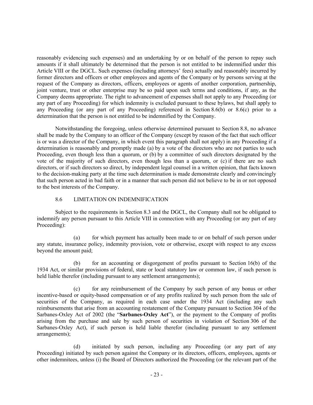 - 23 - reasonably evidencing such expenses) and an undertaking by or on behalf of the person to repay such amounts if it shall ultimately be determined that the person is not entitled to be indemnified under this Article VIII or the DGCL. Such expenses (including attorneys’ fees) actually and reasonably incurred by former directors and officers or other employees and agents of the Company or by persons serving at the request of the Company as directors, officers, employees or agents of another corporation, partnership, joint venture, trust or other enterprise may be so paid upon such terms and conditions, if any, as the Company deems appropriate. The right to advancement of expenses shall not apply to any Proceeding (or any part of any Proceeding) for which indemnity is excluded pursuant to these bylaws, but shall apply to any Proceeding (or any part of any Proceeding) referenced in Section 8.6(b) or 8.6(c) prior to a determination that the person is not entitled to be indemnified by the Company. Notwithstanding the foregoing, unless otherwise determined pursuant to Section 8.8, no advance shall be made by the Company to an officer of the Company (except by reason of the fact that such officer is or was a director of the Company, in which event this paragraph shall not apply) in any Proceeding if a determination is reasonably and promptly made (a) by a vote of the directors who are not parties to such Proceeding, even though less than a quorum, or (b) by a committee of such directors designated by the vote of the majority of such directors, even though less than a quorum, or (c) if there are no such directors, or if such directors so direct, by independent legal counsel in a written opinion, that facts known to the decision-making party at the time such determination is made demonstrate clearly and convincingly that such person acted in bad faith or in a manner that such person did not believe to be in or not opposed to the best interests of the Company. 8.6 LIMITATION ON INDEMNIFICATION Subject to the requirements in Section 8.3 and the DGCL, the Company shall not be obligated to indemnify any person pursuant to this Article VIII in connection with any Proceeding (or any part of any Proceeding): for which payment has actually been made to or on behalf of such person under any statute, insurance policy, indemnity provision, vote or otherwise, except with respect to any excess beyond the amount paid; for an accounting or disgorgement of profits pursuant to Section 16(b) of the 1934 Act, or similar provisions of federal, state or local statutory law or common law, if such person is held liable therefor (including pursuant to any settlement arrangements); for any reimbursement of the Company by such person of any bonus or other incentive-based or equity-based compensation or of any profits realized by such person from the sale of securities of the Company, as required in each case under the 1934 Act (including any such reimbursements that arise from an accounting restatement of the Company pursuant to Section 304 of the Sarbanes-Oxley Act of 2002 (the “Sarbanes-Oxley Act”), or the payment to the Company of profits arising from the purchase and sale by such person of securities in violation of Section 306 of the Sarbanes-Oxley Act), if such person is held liable therefor (including pursuant to any settlement arrangements); initiated by such person, including any Proceeding (or any part of any Proceeding) initiated by such person against the Company or its directors, officers, employees, agents or other indemnitees, unless (i) the Board of Directors authorized the Proceeding (or the relevant part of the
