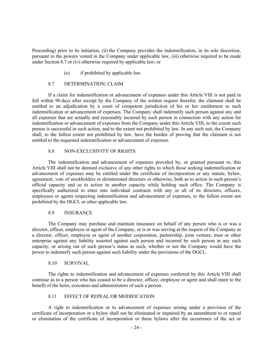 - 24 - Proceeding) prior to its initiation, (ii) the Company provides the indemnification, in its sole discretion, pursuant to the powers vested in the Company under applicable law, (iii) otherwise required to be made under Section 8.7 or (iv) otherwise required by applicable law; or if prohibited by applicable law. 8.7 DETERMINATION; CLAIM If a claim for indemnification or advancement of expenses under this Article VIII is not paid in full within 90 days after receipt by the Company of the written request therefor, the claimant shall be entitled to an adjudication by a court of competent jurisdiction of his or her entitlement to such indemnification or advancement of expenses. The Company shall indemnify such person against any and all expenses that are actually and reasonably incurred by such person in connection with any action for indemnification or advancement of expenses from the Company under this Article VIII, to the extent such person is successful in such action, and to the extent not prohibited by law. In any such suit, the Company shall, to the fullest extent not prohibited by law, have the burden of proving that the claimant is not entitled to the requested indemnification or advancement of expenses. 8.8 NON-EXCLUSIVITY OF RIGHTS The indemnification and advancement of expenses provided by, or granted pursuant to, this Article VIII shall not be deemed exclusive of any other rights to which those seeking indemnification or advancement of expenses may be entitled under the certificate of incorporation or any statute, bylaw, agreement, vote of stockholders or disinterested directors or otherwise, both as to action in such person’s official capacity and as to action in another capacity while holding such office. The Company is specifically authorized to enter into individual contracts with any or all of its directors, officers, employees or agents respecting indemnification and advancement of expenses, to the fullest extent not prohibited by the DGCL or other applicable law. 8.9 INSURANCE The Company may purchase and maintain insurance on behalf of any person who is or was a director, officer, employee or agent of the Company, or is or was serving at the request of the Company as a director, officer, employee or agent of another corporation, partnership, joint venture, trust or other enterprise against any liability asserted against such person and incurred by such person in any such capacity, or arising out of such person’s status as such, whether or not the Company would have the power to indemnify such person against such liability under the provisions of the DGCL. 8.10 SURVIVAL The rights to indemnification and advancement of expenses conferred by this Article VIII shall continue as to a person who has ceased to be a director, officer, employee or agent and shall inure to the benefit of the heirs, executors and administrators of such a person. 8.11 EFFECT OF REPEAL OR MODIFICATION A right to indemnification or to advancement of expenses arising under a provision of the certificate of incorporation or a bylaw shall not be eliminated or impaired by an amendment to or repeal or elimination of the certificate of incorporation or these bylaws after the occurrence of the act or