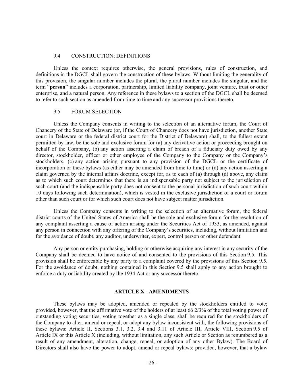 - 26 - 9.4 CONSTRUCTION; DEFINITIONS Unless the context requires otherwise, the general provisions, rules of construction, and definitions in the DGCL shall govern the construction of these bylaws. Without limiting the generality of this provision, the singular number includes the plural, the plural number includes the singular, and the term “person” includes a corporation, partnership, limited liability company, joint venture, trust or other enterprise, and a natural person. Any reference in these bylaws to a section of the DGCL shall be deemed to refer to such section as amended from time to time and any successor provisions thereto. 9.5 FORUM SELECTION Unless the Company consents in writing to the selection of an alternative forum, the Court of Chancery of the State of Delaware (or, if the Court of Chancery does not have jurisdiction, another State court in Delaware or the federal district court for the District of Delaware) shall, to the fullest extent permitted by law, be the sole and exclusive forum for (a) any derivative action or proceeding brought on behalf of the Company, (b) any action asserting a claim of breach of a fiduciary duty owed by any director, stockholder, officer or other employee of the Company to the Company or the Company’s stockholders, (c) any action arising pursuant to any provision of the DGCL or the certificate of incorporation or these bylaws (as either may be amended from time to time) or (d) any action asserting a claim governed by the internal affairs doctrine, except for, as to each of (a) through (d) above, any claim as to which such court determines that there is an indispensable party not subject to the jurisdiction of such court (and the indispensable party does not consent to the personal jurisdiction of such court within 10 days following such determination), which is vested in the exclusive jurisdiction of a court or forum other than such court or for which such court does not have subject matter jurisdiction. Unless the Company consents in writing to the selection of an alternative forum, the federal district courts of the United States of America shall be the sole and exclusive forum for the resolution of any complaint asserting a cause of action arising under the Securities Act of 1933, as amended, against any person in connection with any offering of the Company’s securities, including, without limitation and for the avoidance of doubt, any auditor, underwriter, expert, control person or other defendant. Any person or entity purchasing, holding or otherwise acquiring any interest in any security of the Company shall be deemed to have notice of and consented to the provisions of this Section 9.5. This provision shall be enforceable by any party to a complaint covered by the provisions of this Section 9.5. For the avoidance of doubt, nothing contained in this Section 9.5 shall apply to any action brought to enforce a duty or liability created by the 1934 Act or any successor thereto. ARTICLE X - AMENDMENTS These bylaws may be adopted, amended or repealed by the stockholders entitled to vote; provided, however, that the affirmative vote of the holders of at least 66 2/3% of the total voting power of outstanding voting securities, voting together as a single class, shall be required for the stockholders of the Company to alter, amend or repeal, or adopt any bylaw inconsistent with, the following provisions of these bylaws: Article II, Sections 3.1, 3.2, 3.4 and 3.11 of Article III, Article VIII, Section 9.5 of Article IX or this Article X (including, without limitation, any such Article or Section as renumbered as a result of any amendment, alteration, change, repeal, or adoption of any other Bylaw). The Board of Directors shall also have the power to adopt, amend or repeal bylaws; provided, however, that a bylaw