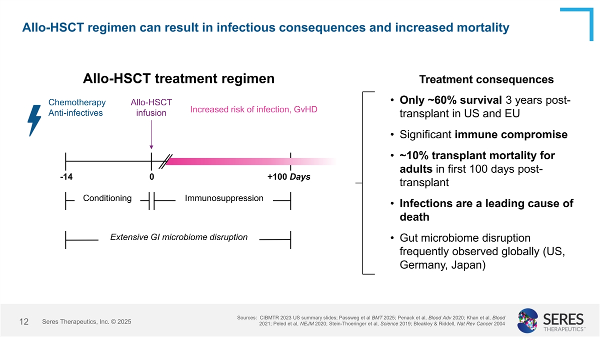 Allo-HSCT regimen can result in infectious consequences and increased mortality Allo-HSCT treatment regimen Treatment consequences • Only ~60% survival 3 years post- Chemotherapy Allo-HSCT Increased risk of infection, GvHD Anti-infectives infusion transplant in US and EU • Significant immune compromise • ~10% transplant mortality for adults in first 100 days post- -14 0 +100 Days transplant Conditioning Immunosuppression • Infections are a leading cause of death Extensive GI microbiome disruption • Gut microbiome disruption frequently observed globally (US, Germany, Japan) Sources: CIBMTR 2023 US summary slides; Passweg et al BMT 2025; Penack et al, Blood Adv 2020; Khan et al, Blood Seres Therapeutics, Inc. © 2025 12 2021; Peled et al, NEJM 2020; Stein-Thoeringer et al, Science 2019; Bleakley & Riddell, Nat Rev Cancer 2004