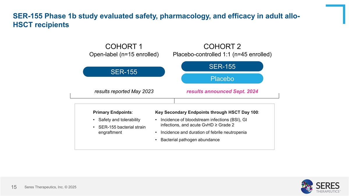 Standards of care to prevent bloodstream infections in allo-HSCT patients are poor and decreasing in efficacy Joint ASCO* and IDSA EBMT guidelines and Infectious Disease recommendation Working Party recommendations • Fluoroquinolones (FQ) recommended • 2022 Workshop recommends move to for antibacterial prophylaxis targeted antibacterial prophylaxis • Prophylaxis recommended during • Multiple analyses suggest reduced infections window of expected neutropenia from antibacterial prophylaxis but no overall survival benefit • High BSI rate happening despite broad FQ prophylaxis in the US • Prophylaxis efficacy decreasing as bacteria become resistant to antibiotics Trends • PTCy adoption for GvHD prophylaxis is increasing BSI rates * ASCO: American Society of Clinical Oncology; IDSA; Infectious Diseases Society of America; EBMT: formerly known as the European Society for Blood and Marrow Transplantation; PTCy: post-transplant cyclophosphamide Seres Therapeutics, Inc. © 2025 14 Sources: Taplitz et al, J Clin Oncol 2018; EBMT 2022 report; Neuerberg et al Transplant Cell Ther 2024; Bolaños-Meade et al, NEJM 2023
