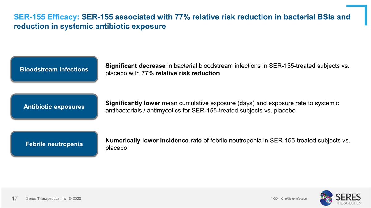 SER-155 Safety: SER-155 was generally well tolerated with no treatment-related SAEs • All but one subject in the placebo arm experienced at least 1 TEAE • Most common for SER-155 treated subjects (≥50% and with Δ ≥5% greater than placebo): Treatment-emergent diarrhea (86% vs. 74% placebo), nausea (62% vs. 53% placebo) adverse events • 1/40 (3%) subject experienced a TEAE leading to treatment discontinuation (active = 0; placebo = 1) (TEAEs) • 3/40 (8%) subjects experienced a TEAE leading to study discontinuation (active = 1; placebo = 2) • 19/40 (48%) subjects experienced an SAE: 11/21 (52%) SER-155-treated subjects vs. 8/19 (42%) placebo-treated subjects; none considered related to SER-155 (no SUSARs) Serious adverse events o Most common SAE SOC: infections & infestations (24% active vs. 37% placebo) (SAEs) o 3 deaths prior to Day 100 (active = 1; placebo = 2), 1 death after Day 100 (active), none considered related to SER-155 Adverse events of • AESIs (bloodstream infections, GI infection, invasive infection): 14/40 (35%) subjects special interest • Rates of AESIs were lower in SER-155 arm vs placebo arm (29% vs 42% respectively) (AESIs) • No SER-155 species were identified in culture from any subject Seres Therapeutics, Inc. © 2025 16