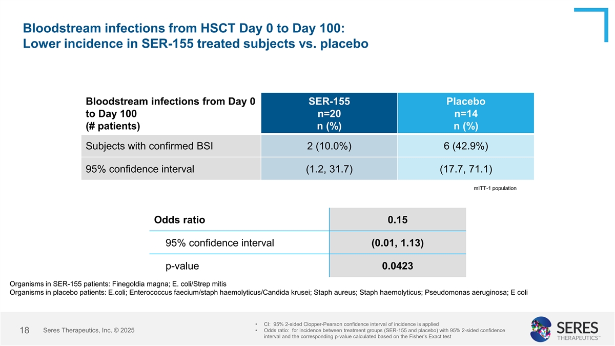 SER-155 Efficacy: SER-155 associated with 77% relative risk reduction in bacterial BSIs and reduction in systemic antibiotic exposure Significant decrease in bacterial bloodstream infections in SER-155-treated subjects vs. Bloodstream infections placebo with 77% relative risk reduction Significantly lower mean cumulative exposure (days) and exposure rate to systemic Antibiotic exposures antibacterials / antimycotics for SER-155-treated subjects vs. placebo Numerically lower incidence rate of febrile neutropenia in SER-155-treated subjects vs. Febrile neutropenia placebo * CDI: C. difficile infection Seres Therapeutics, Inc. © 2025 17