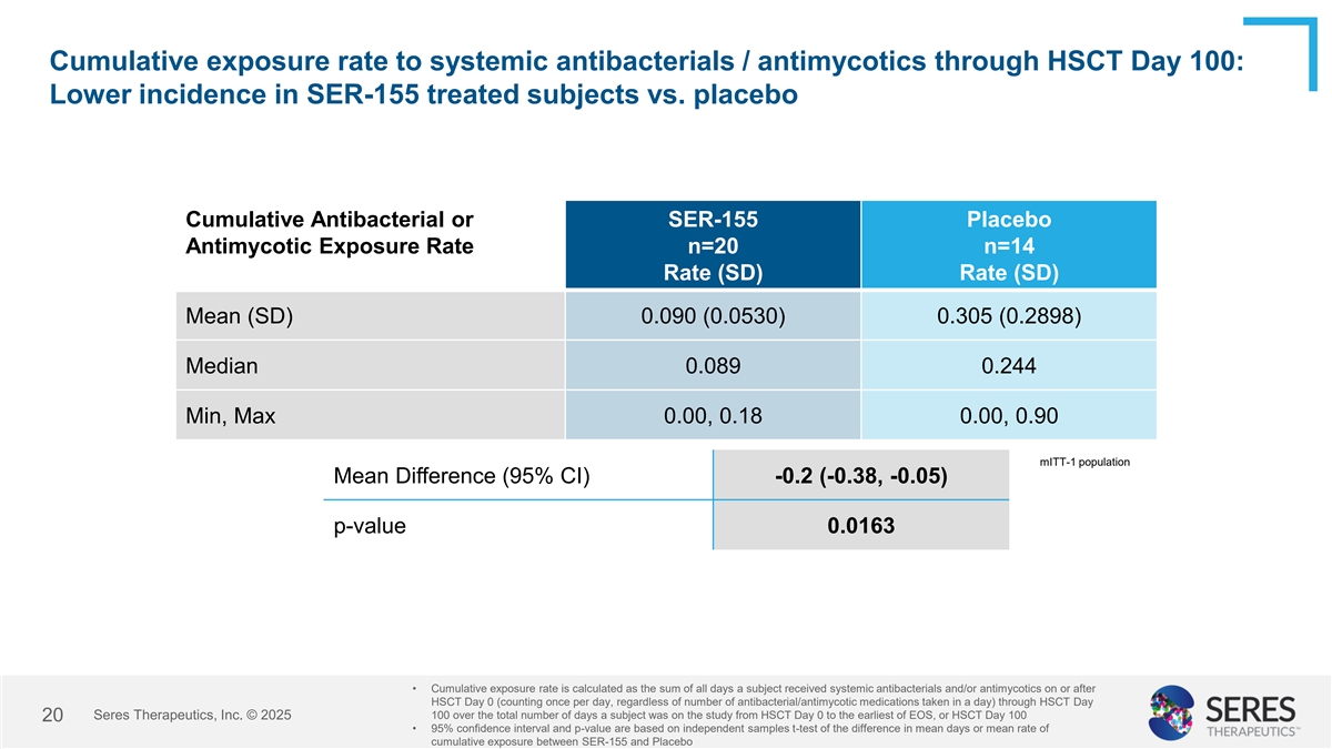 Cumulative exposure to systemic antibacterials / antimycotics through HSCT Day 100: Lower incidence in SER-155 treated subjects vs. placebo Cumulative Antibacterial or SER-155 Placebo Antimycotic Exposure n=20 n=14 (HSCT Days) n (SD) n (SD) Mean (SD) 9.2 (5.44) 21.1 (20.31) Median 9.0 14.0 Min, Max 0, 19 0, 74 mITT-1 population Mean Difference (95% CI) -11.9 (-23.85, -0.04) p-value 0.0494 • Cumulative exposure is the sum of all days a subject received systemic antibacterials and/or antimycotics between HSCT Day 0 through Day 100; counting once per day regardless of number of agents taken Seres Therapeutics, Inc. © 2025 19 • 95% confidence interval and p-value based on independent samples t-test of the difference in mean days between SER- 155 and placebo