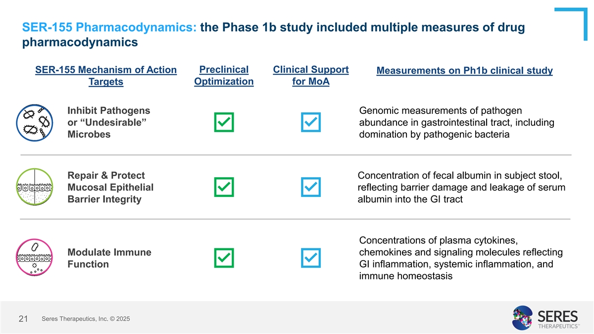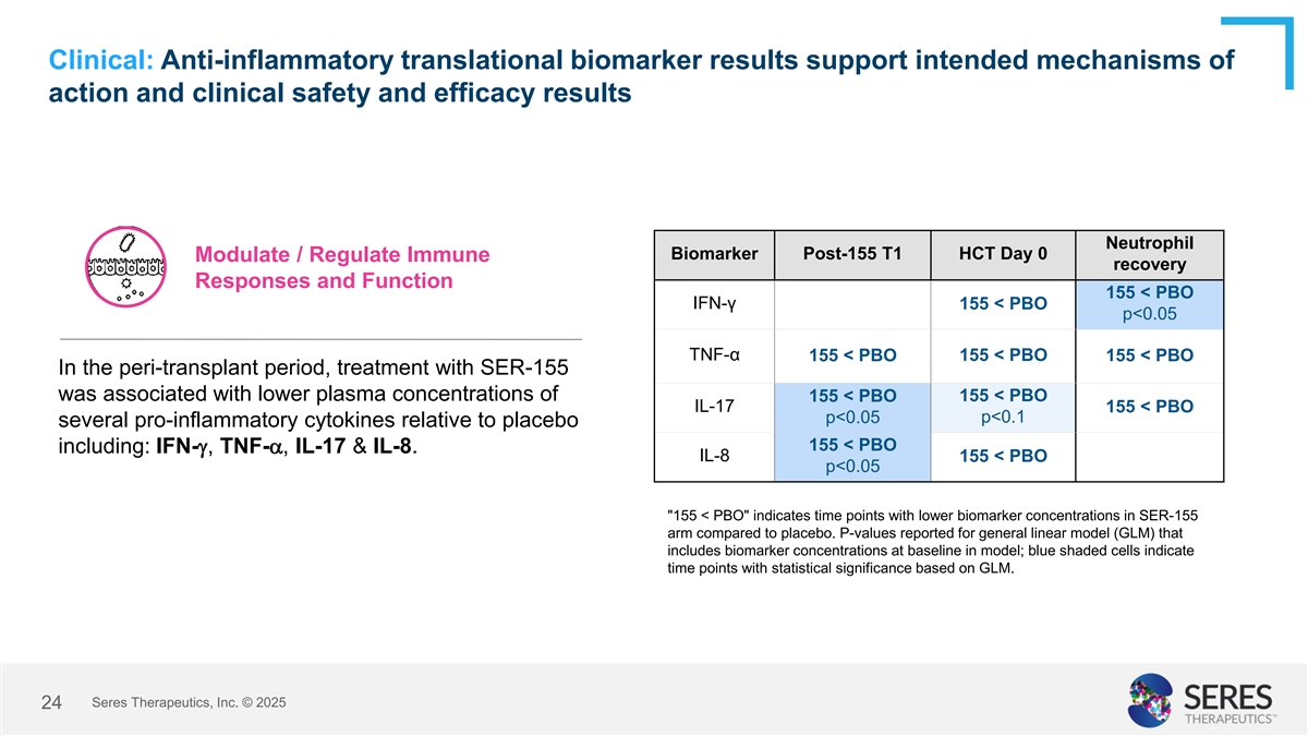 Clinical: Anti-inflammatory translational biomarker results support intended mechanisms of action and clinical safety and efficacy results Neutrophil Biomarker Post-155 T1 HCT Day 0 Modulate / Regulate Immune recovery Responses and Function 155 < PBO IFN-γ 155 < PBO p<0.05 TNF-α 155 < PBO 155 < PBO 155 < PBO In the peri-transplant period, treatment with SER-155 was associated with lower plasma concentrations of 155 < PBO 155 < PBO IL-17 155 < PBO p<0.1 p<0.05 several pro-inflammatory cytokines relative to placebo 155 < PBO including: IFN-g, TNF-a, IL-17 & IL-8. IL-8 155 < PBO p<0.05 155 < PBO indicates time points with lower biomarker concentrations in SER-155 arm compared to placebo. P-values reported for general linear model (GLM) that includes biomarker concentrations at baseline in model; blue shaded cells indicate time points with statistical significance based on GLM. Seres Therapeutics, Inc. © 2025 24