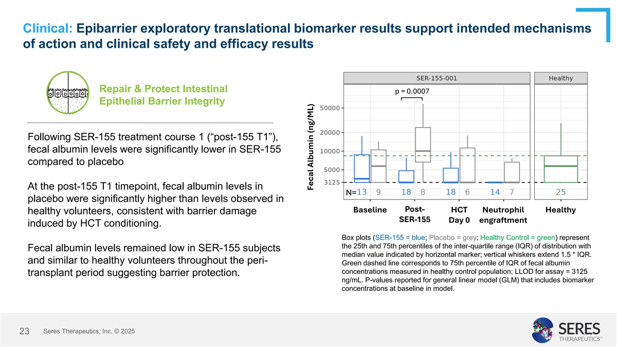 Clinical: Epibarrier exploratory translational biomarker results support intended mechanisms of action and clinical safety and efficacy results Repair & Protect Intestinal p = 0.0007 Epithelial Barrier Integrity Following SER-155 treatment course 1 (“post-155 T1”), fecal albumin levels were significantly lower in SER-155 compared to placebo At the post-155 T1 timepoint, fecal albumin levels in N= placebo were significantly higher than levels observed in Post- Baseline HCT Neutrophil Healthy healthy volunteers, consistent with barrier damage SER-155 Day 0 engraftment induced by HCT conditioning. Box plots (SER-155 = blue; Placebo = grey; Healthy Control = green) represent the 25th and 75th percentiles of the inter-quartile range (IQR) of distribution with Fecal albumin levels remained low in SER-155 subjects median value indicated by horizontal marker; vertical whiskers extend 1.5 * IQR. and similar to healthy volunteers throughout the peri- Green dashed line corresponds to 75th percentile of IQR of fecal albumin concentrations measured in healthy control population; LLOD for assay = 3125 transplant period suggesting barrier protection. ng/mL. P-values reported for general linear model (GLM) that includes biomarker concentrations at baseline in model. Seres Therapeutics, Inc. © 2025 23 Fecal Albumin (ng/ML)