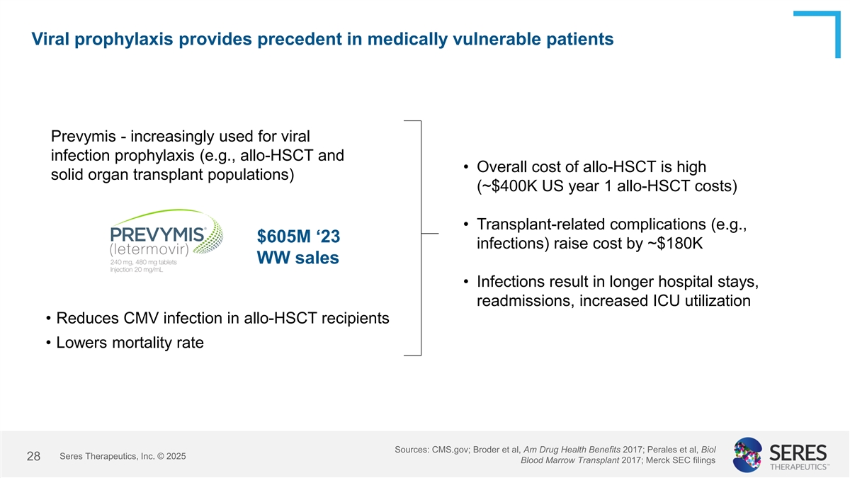US payers confirm high unmet clinical need for infection prophylaxis in allo- HSCT recipients and robust profile of SER-155 Clinical Burden Rating • High perceived clinical burden of BSIs within the allo-HSCT patient population is driven by high frequency of occurrences and poor associated outcomes HIGH • Lack of an efficacious prophylactic therapy that successfully limits incidence of High clinical burden BSIs is considered a key unmet need and current driver of clinical burden and unmet need • Top unaided clinical concerns raised by payers include risk of febrile neutropenia, sepsis, and antibiotic-resistant infection LOW • Proposed risk reduction of BSIs and related endpoints were seen as clinically meaningful and supportive of value proposition Profile of SER-155 • “The reductions in primary and secondary endpoints are encouraging and brings positively received hope that you are going to escape this risky scary complication of cancer therapy.” Site of dispensing • Oral administration is viewed as convenient by payers, with most expecting coverage under outpatient pharmacy benefit given oral administration likely outside of the drives reimbursement hospital setting pathway Seres Therapeutics, Inc. © 2025 Source: Q4 2024 US market research with sample including national and regional health plans + PBMs representing ~128M covered lives 27