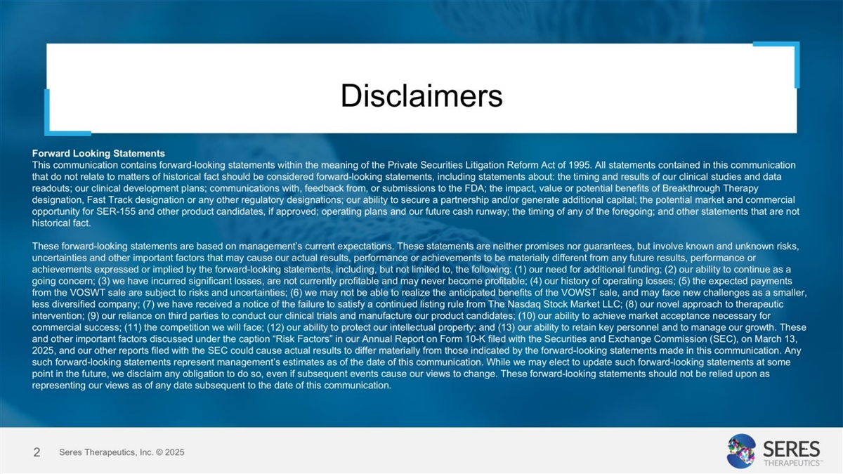 Exhibit 99.2 Seres Therapeutics Investor Presentation March 2025