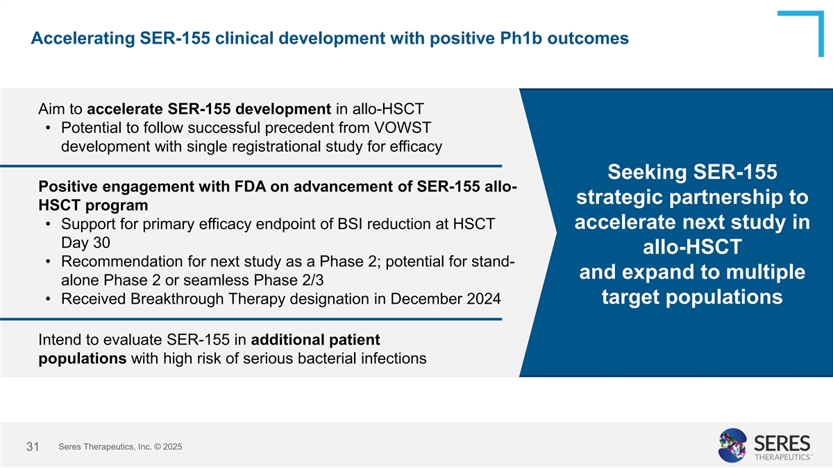 Indication expansion: potential 10x addressable population Broader leukemia & Allo-HSCT Autologous HSCT lymphoma population* WW annual ~40,000 ~60,000 ~500,000 diagnoses or transplants US annual ~9,300 ~13,500 ~87,000 diagnoses or initial focus transplants Unmet needs Prevent mortality and Prevent mortality and Reduce morbidity, addressed by cost of post- costs of post- mortality, and cost of SER-155 transaction infections transplant infections infections and febrile neutropenia from chemotherapy *Includes acute myeloid leukemia, multiple myeloma, and aggressive B cell non-Hodgkin lymphomas (diffuse large B-cell lymphoma, mantle cell, Burkitt’s lymphoma) Seres Therapeutics, Inc. © 2025 30 Sources: CIBMTR, US NCI SEER, Thandra et al 2021 report of WHO data, Niederwieser et al Haematologica 2022; WHO Global Cancer Observatory; American Cancer Society
