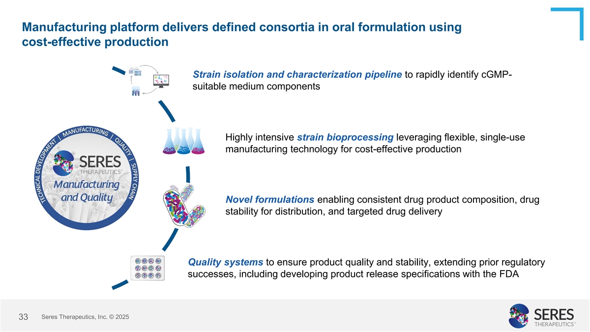 Manufacturing platform delivers defined consortia in oral formulation using cost-effective production Strain isolation and characterization pipeline to rapidly identify cGMP- suitable medium components Highly intensive strain bioprocessing leveraging flexible, single-use manufacturing technology for cost-effective production Novel formulations enabling consistent drug product composition, drug stability for distribution, and targeted drug delivery Quality systems to ensure product quality and stability, extending prior regulatory successes, including developing product release specifications with the FDA Seres Therapeutics, Inc. © 2025 33