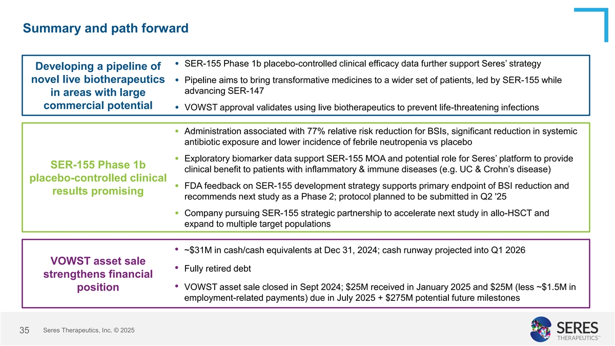 Maximizing opportunity of live biotherapeutics going forward • Prevent life-threatening bacterial infections, including antimicrobial resistant infections in additional populations Additional • Treat immune-related diseases (e.g., IBD, GvHD, checkpoint Opportunities colitis) • Infections in Chronic liver disease: Progressing towards IND readiness SER-147 • Indication expansion (e.g., radiation enteritis, ICU and long-term care patients, organ transplant) • Bloodstream infections in Allo-HSCT: Engaging with FDA to advance; constructive feedback on SER-155 development strategy; received Breakthrough Therapy designation SER-155 • Evaluate in additional cancer treatment populations with high risk of serious bacterial infections VOWST • rCDI: Proven clinical and regulatory success; asset sale to Nestlé; Seres to participate in future milestones Seres Therapeutics, Inc. © 2025 34