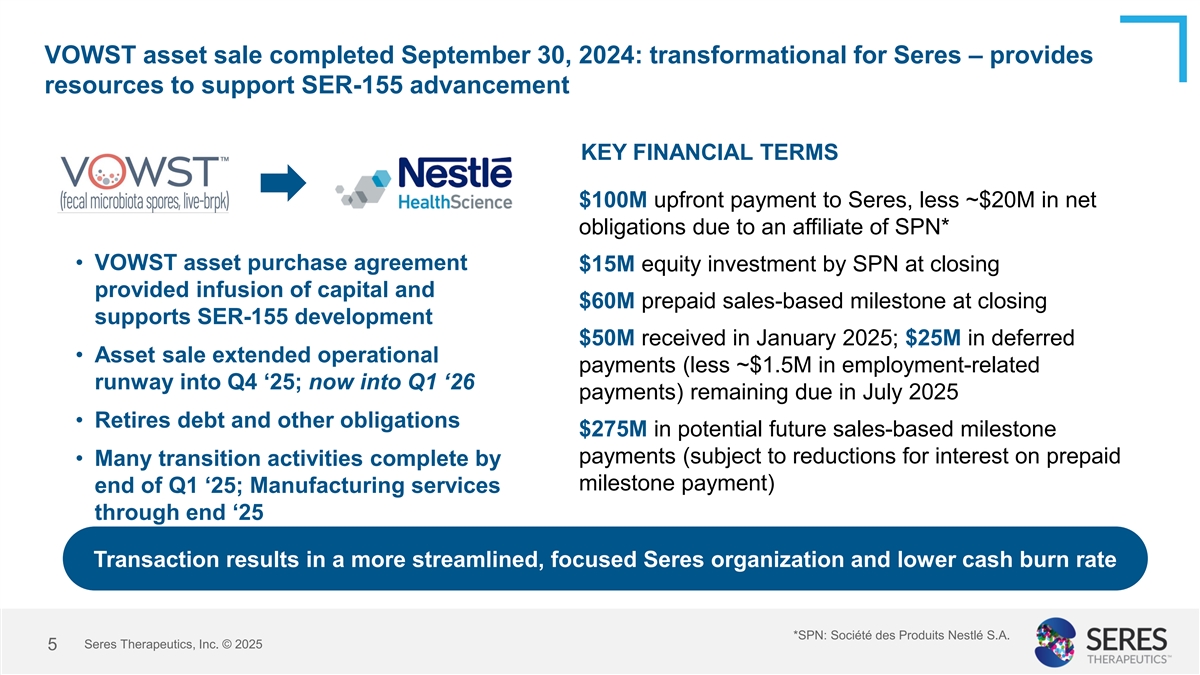 Validated therapeutic modality and platform: Seres pioneered the development and FDA approval of VOWST as the first-ever oral live microbiome therapeutic DRAMATIC CLINICAL BENEFIT – Preventing infection recurrence Approximately 88% FDA approved (April 2023) to prevent the recurrence of sustained clinical response rate (C. diff. recurrence, at up to 8 weeks) C. difficile infection in adults VOWST asset sale (completed September 2024) provided capital to support pipeline advancement and resulted in a more streamlined, focused organization Source: Feuerstadt P et al. N Engl J Med. 2022;386(3):220-229 Seres Therapeutics, Inc. © 2025 4