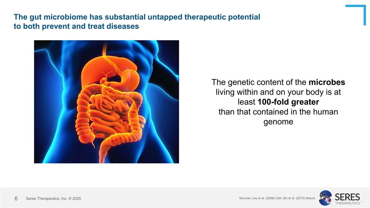 The gut microbiome has substantial untapped therapeutic potential to both prevent and treat diseases The genetic content of the microbes living within and on your body is at least 100-fold greater than that contained in the human genome Sources: Ley et al. (2006) Cell; Qin et al. (2010) Nature Seres Therapeutics, Inc. © 2025 6