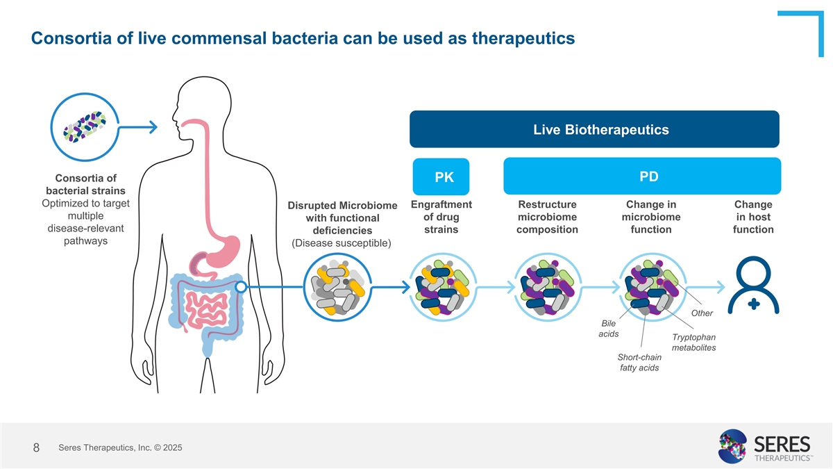 Disrupted gastrointestinal microbiome is mechanistically linked to infections and disease Disrupted & Disease Susceptible Not Disrupted Impacted Biology & Disease Relevance Pathogen or “undesirable” microbe abundance Increased pathogen abundance, in combination with impaired barrier integrity Lost epithelial barrier & and decreased immune mucosal integrity function… …enables bacterial and antigen translocation leading Unfavorable immune to infections & inflammation responses Seres Therapeutics, Inc. © 2025 7