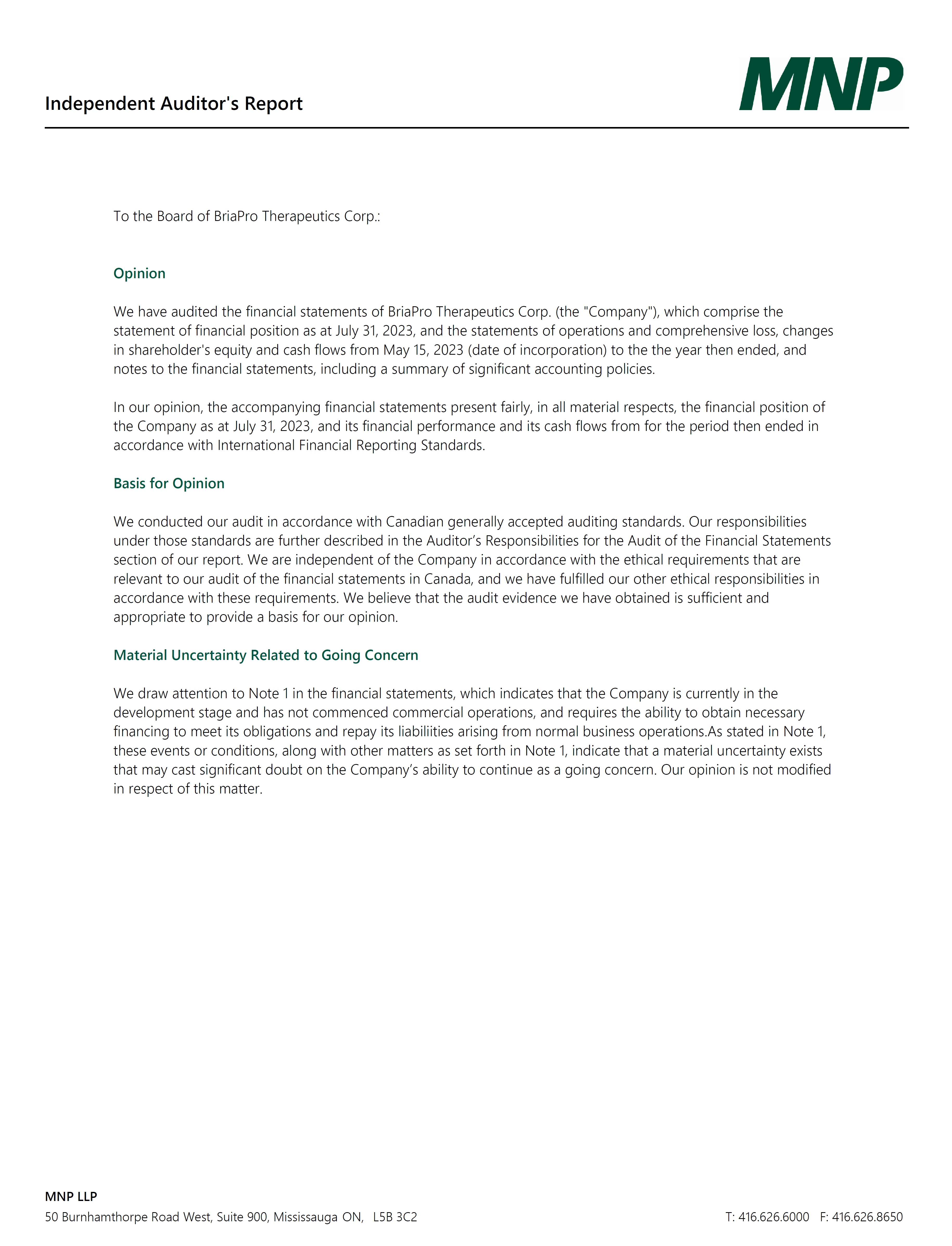 a. BriaPro Therapeutics Corp. (“BriaPro” or the “Company”) was incorporated under the Business Corporations Act (British Columbia) on May 15, 2023. As of July 31, 2023 the Company was inactive, however, following the completion of the Arrangement (as defined below), BriaPro is now a pre-clinical immuno-oncology biotechnology company with multiple assets, specifically Bria-TILsRx™, and PKCδ inhibitors for multiple indications including cancer. The Company’s head office is located at 235 15th Street, Suite 300, West Vancouver B.C, V7T 2X1, Canada. The Company is an unlisted reporting issuer in Canada.