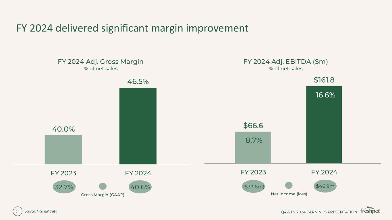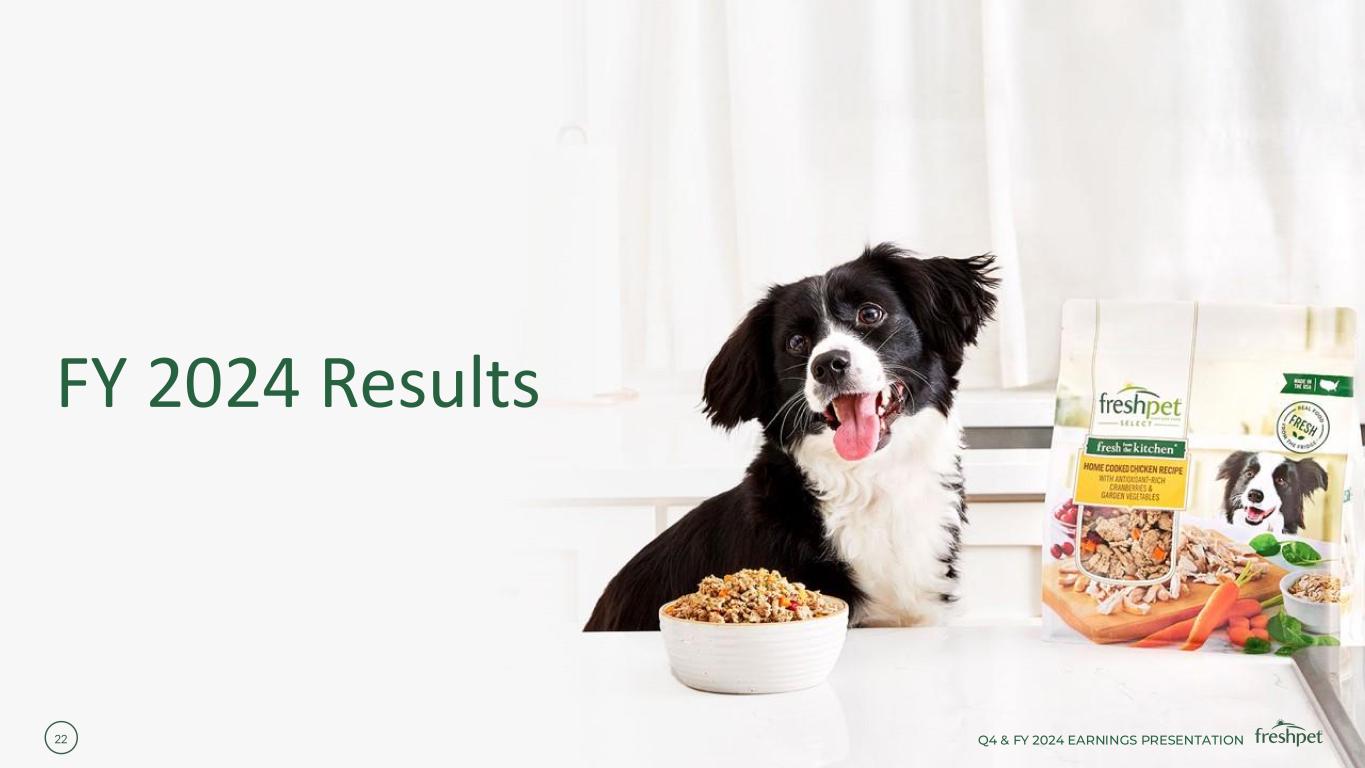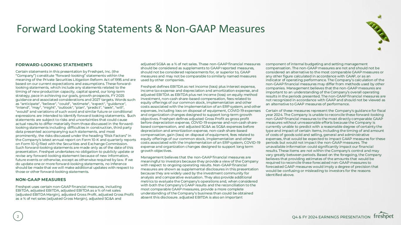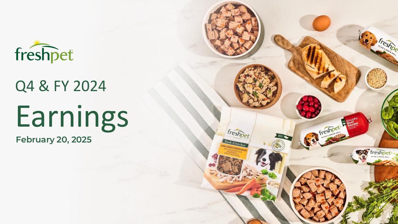 Q4 & FY 2024 EARNINGS PRESENTATION2 Q4 & FY 024 EAR INGS PR SEN ATION Forward Looking Statements & Non-GAAP Measures FORWARD-LOOKING STATEMENTS Certain statements in this presentation by Freshpet, Inc. (the “Company”) constitute “forward-looking” statements within the meaning of the Private Securities Litigation Reform Act of 1995 and are based on our current expectations and assumptions. These forward- looking statements, which include any statements related to the timing of new production capacity, capital spend, our long-term strategy, pace in achieving our goals, growth prospects, FY 2025 guidance and associated considerations and 2027 targets. Words such as "anticipate", "believe", "could", "estimate", "expect", "guidance", "intend", "may", "might", "outlook", "plan", "predict", "seek", "will", "would" and variations of such word and similar future or conditional expressions are intended to identify forward looking statements. Such statements are subject to risks and uncertainties that could cause actual results to differ materially from those discussed in the forward- looking statements including difficulties in construction, third party data presented accompanying such statements, and most prominently, the risks discussed under the heading “Risk Factors” in the Company's latest annual report on Form 10-K and quarterly reports on Form 10-Q filed with the Securities and Exchange Commission. Such forward-looking statements are made only as of the date of this presentation. Freshpet undertakes no obligation to publicly update or revise any forward-looking statement because of new information, future events or otherwise, except as otherwise required by law. If we do update one or more forward-looking statements, no inference should be made that we will make additional updates with respect to those or other forward-looking statements. NON-GAAP MEASURES Freshpet uses certain non-GAAP financial measures, including EBITDA, adjusted EBITDA, adjusted EBITDA as a % of net sales (adjusted EBITDA Margin), adjusted Gross Profit, adjusted Gross Profit as a % of net sales (adjusted Gross Margin), adjusted SG&A and adjusted SG&A as a % of net sales. These non-GAAP financial measures should be considered as supplements to GAAP reported measures, should not be considered replacements for, or superior to, GAAP measures and may not be comparable to similarly named measures used by other companies. Freshpet defines EBITDA as net income (loss) plus interest expense, income tax expense and depreciation and amortization expense, and adjusted EBITDA as EBITDA plus net income (loss) on equity method investment, non-cash share-based compensation, fees related to equity offerings of our common stock, implementation and other costs associated with the implementation of an ERP system, and other expenses, including loss on disposal of equipment, COVID-19 expenses and organization changes designed to support long-term growth objectives. Freshpet defines adjusted Gross Profit as gross profit before depreciation expense, COVID-19 expense and non-cash share- based compensation, and adjusted SG&A as SG&A expenses before depreciation and amortization expense, non-cash share-based compensation, gain (loss) on disposal of equipment, fees related to equity offerings of our common stock, implementation and other costs associated with the implementation of an ERP system, COVID-19 expense and organization changes designed to support long term growth objectives. Management believes that the non-GAAP financial measures are meaningful to investors because they provide a view of the Company with respect to ongoing operating results. Non-GAAP financial measures are shown as supplemental disclosures in this presentation because they are widely used by the investment community for analysis and comparative evaluation. They also provide additional metrics to evaluate the Company’s operations and, when considered with both the Company’s GAAP results and the reconciliation to the most comparable GAAP measures, provide a more complete understanding of the Company’s business than could be obtained absent this disclosure. adjusted EBITDA is also an important component of internal budgeting and setting management compensation. The non-GAAP measures are not and should not be considered an alternative to the most comparable GAAP measures or any other figure calculated in accordance with GAAP, or as an indicator of operating performance. The Company’s calculation of the non-GAAP financial measures may differ from methods used by other companies. Management believes that the non-GAAP measures are important to an understanding of the Company’s overall operating results in the periods presented. The non-GAAP financial measures are not recognized in accordance with GAAP and should not be viewed as an alternative to GAAP measures of performance. Certain of these measures represent the Company's guidance for fiscal year 2024. The Company is unable to reconcile these forward-looking non-GAAP financial measures to the most directly comparable GAAP measures without unreasonable efforts because the Company is currently unable to predict with a reasonable degree of certainty the type and impact of certain items, including the timing of and amount of costs of goods sold and selling, general and administrative expenses, that would be expected to impact GAAP measures for these periods but would not impact the non-GAAP measures. The unavailable information could significantly impact our financial results. These items are not within the Company's control and may vary greatly between periods. Based on the foregoing, the Company believes that providing estimates of the amounts that would be required to reconcile these forecasted non-GAAP measures to forecasted GAAP measures would imply a degree of precision that would be confusing or misleading to investors for the reasons identified above.