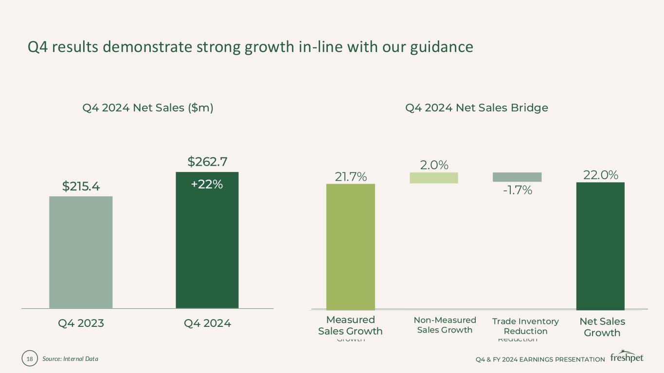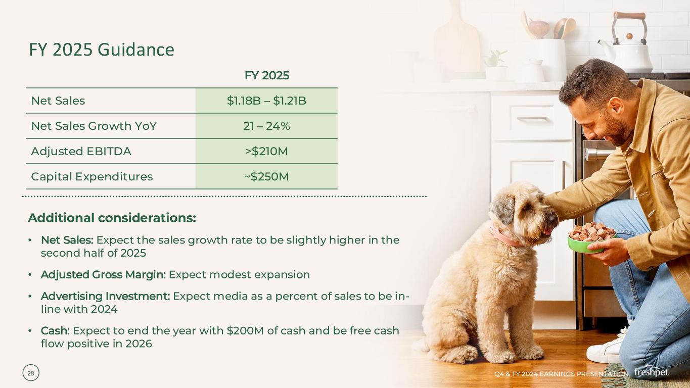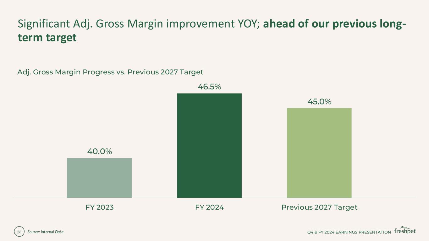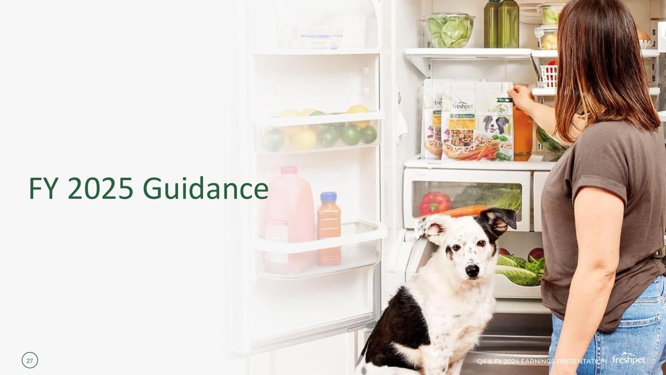 Q4 & FY 2024 EARNINGS PRESENTATION2 Q4 & FY 024 EAR INGS PR SEN ATION Forward Looking Statements & Non-GAAP Measures FORWARD-LOOKING STATEMENTS Certain statements in this presentation by Freshpet, Inc. (the “Company”) constitute “forward-looking” statements within the meaning of the Private Securities Litigation Reform Act of 1995 and are based on our current expectations and assumptions. These forward- looking statements, which include any statements related to the timing of new production capacity, capital spend, our long-term strategy, pace in achieving our goals, growth prospects, FY 2025 guidance and associated considerations and 2027 targets. Words such as "anticipate", "believe", "could", "estimate", "expect", "guidance", "intend", "may", "might", "outlook", "plan", "predict", "seek", "will", "would" and variations of such word and similar future or conditional expressions are intended to identify forward looking statements. Such statements are subject to risks and uncertainties that could cause actual results to differ materially from those discussed in the forward- looking statements including difficulties in construction, third party data presented accompanying such statements, and most prominently, the risks discussed under the heading “Risk Factors” in the Company's latest annual report on Form 10-K and quarterly reports on Form 10-Q filed with the Securities and Exchange Commission. Such forward-looking statements are made only as of the date of this presentation. Freshpet undertakes no obligation to publicly update or revise any forward-looking statement because of new information, future events or otherwise, except as otherwise required by law. If we do update one or more forward-looking statements, no inference should be made that we will make additional updates with respect to those or other forward-looking statements. NON-GAAP MEASURES Freshpet uses certain non-GAAP financial measures, including EBITDA, adjusted EBITDA, adjusted EBITDA as a % of net sales (adjusted EBITDA Margin), adjusted Gross Profit, adjusted Gross Profit as a % of net sales (adjusted Gross Margin), adjusted SG&A and adjusted SG&A as a % of net sales. These non-GAAP financial measures should be considered as supplements to GAAP reported measures, should not be considered replacements for, or superior to, GAAP measures and may not be comparable to similarly named measures used by other companies. Freshpet defines EBITDA as net income (loss) plus interest expense, income tax expense and depreciation and amortization expense, and adjusted EBITDA as EBITDA plus net income (loss) on equity method investment, non-cash share-based compensation, fees related to equity offerings of our common stock, implementation and other costs associated with the implementation of an ERP system, and other expenses, including loss on disposal of equipment, COVID-19 expenses and organization changes designed to support long-term growth objectives. Freshpet defines adjusted Gross Profit as gross profit before depreciation expense, COVID-19 expense and non-cash share- based compensation, and adjusted SG&A as SG&A expenses before depreciation and amortization expense, non-cash share-based compensation, gain (loss) on disposal of equipment, fees related to equity offerings of our common stock, implementation and other costs associated with the implementation of an ERP system, COVID-19 expense and organization changes designed to support long term growth objectives. Management believes that the non-GAAP financial measures are meaningful to investors because they provide a view of the Company with respect to ongoing operating results. Non-GAAP financial measures are shown as supplemental disclosures in this presentation because they are widely used by the investment community for analysis and comparative evaluation. They also provide additional metrics to evaluate the Company’s operations and, when considered with both the Company’s GAAP results and the reconciliation to the most comparable GAAP measures, provide a more complete understanding of the Company’s business than could be obtained absent this disclosure. adjusted EBITDA is also an important component of internal budgeting and setting management compensation. The non-GAAP measures are not and should not be considered an alternative to the most comparable GAAP measures or any other figure calculated in accordance with GAAP, or as an indicator of operating performance. The Company’s calculation of the non-GAAP financial measures may differ from methods used by other companies. Management believes that the non-GAAP measures are important to an understanding of the Company’s overall operating results in the periods presented. The non-GAAP financial measures are not recognized in accordance with GAAP and should not be viewed as an alternative to GAAP measures of performance. Certain of these measures represent the Company's guidance for fiscal year 2024. The Company is unable to reconcile these forward-looking non-GAAP financial measures to the most directly comparable GAAP measures without unreasonable efforts because the Company is currently unable to predict with a reasonable degree of certainty the type and impact of certain items, including the timing of and amount of costs of goods sold and selling, general and administrative expenses, that would be expected to impact GAAP measures for these periods but would not impact the non-GAAP measures. The unavailable information could significantly impact our financial results. These items are not within the Company's control and may vary greatly between periods. Based on the foregoing, the Company believes that providing estimates of the amounts that would be required to reconcile these forecasted non-GAAP measures to forecasted GAAP measures would imply a degree of precision that would be confusing or misleading to investors for the reasons identified above.