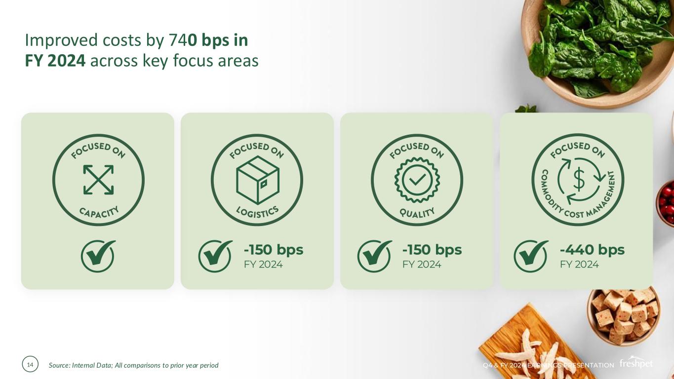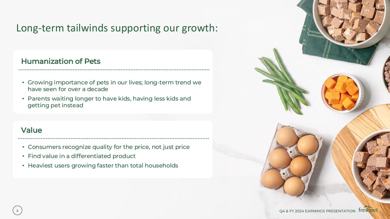 Q4 & FY 2024 EARNINGS PRESENTATION7 Strong performance driven by key fundamentals: • Strong, consistent net sales growth • Volume-based growth of 26% in fiscal year 2024 • Household penetration growth of 17% and heaviest users growing even faster • Media spend continuing to drive household penetration at favorable costs • 740 basis point improvement across quality, input, and logistics costs in FY 2024 and exceeded previously provided 2027 targets • Reducing turnover and skilled production workforce were instrumental in creating sustainable operating leverage • Expanding capacity on-budget and on-time while improving margins • Strong fill rates (99%+ in Q4 2024) demonstrate effectiveness of disciplined growth strategy Strength of the Freshpet growth model Improved operational effectiveness Operating discipline to balance capacity and demand at a high growth rate Source: Internal data; Numerator Panel data for the 52-week periods ending 12/31/24